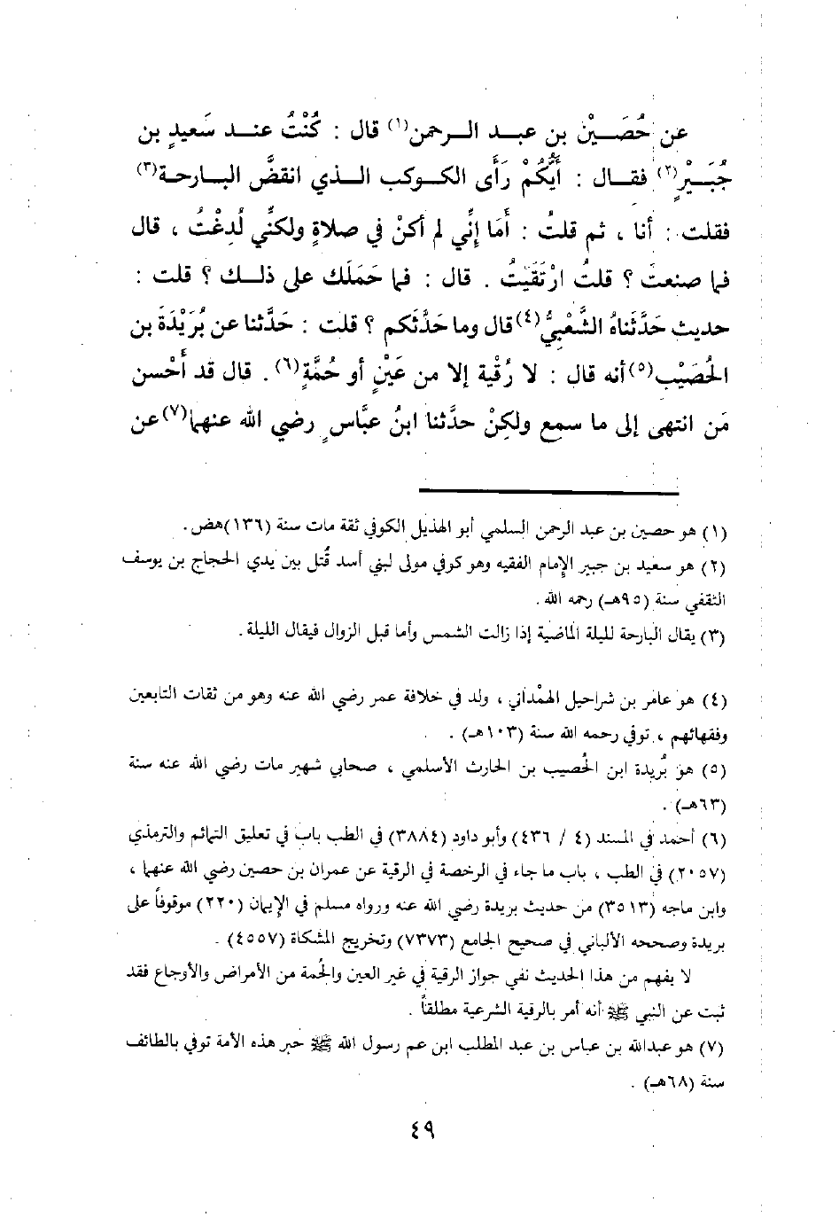 عن " حصين بن عبد الرحمن1 قال: كنت عند سعيد بن جبير2 فقال: أيكم رأى الكوكب الذي انقض البارحة3 فقلت: أنا. ثم قلت: أما إني لم أكن في صلاة ولكني لدغت. قال: فما صنعت؟ قلت ارتقيت. قال: فما حملك على ذلك؟ قلت: حديث حدثناه الشعبي4. قال: وما حدثكم؟ قلت: حدثنا عن بريدة بن الحصيب5 أنه قال: لا رقية إلا من عين أو حمة6. قال: قد أحسن من انتهى إلى ما سمع، ولكن حدثنا ابن عباس -رضي الله عنهما-7 عن