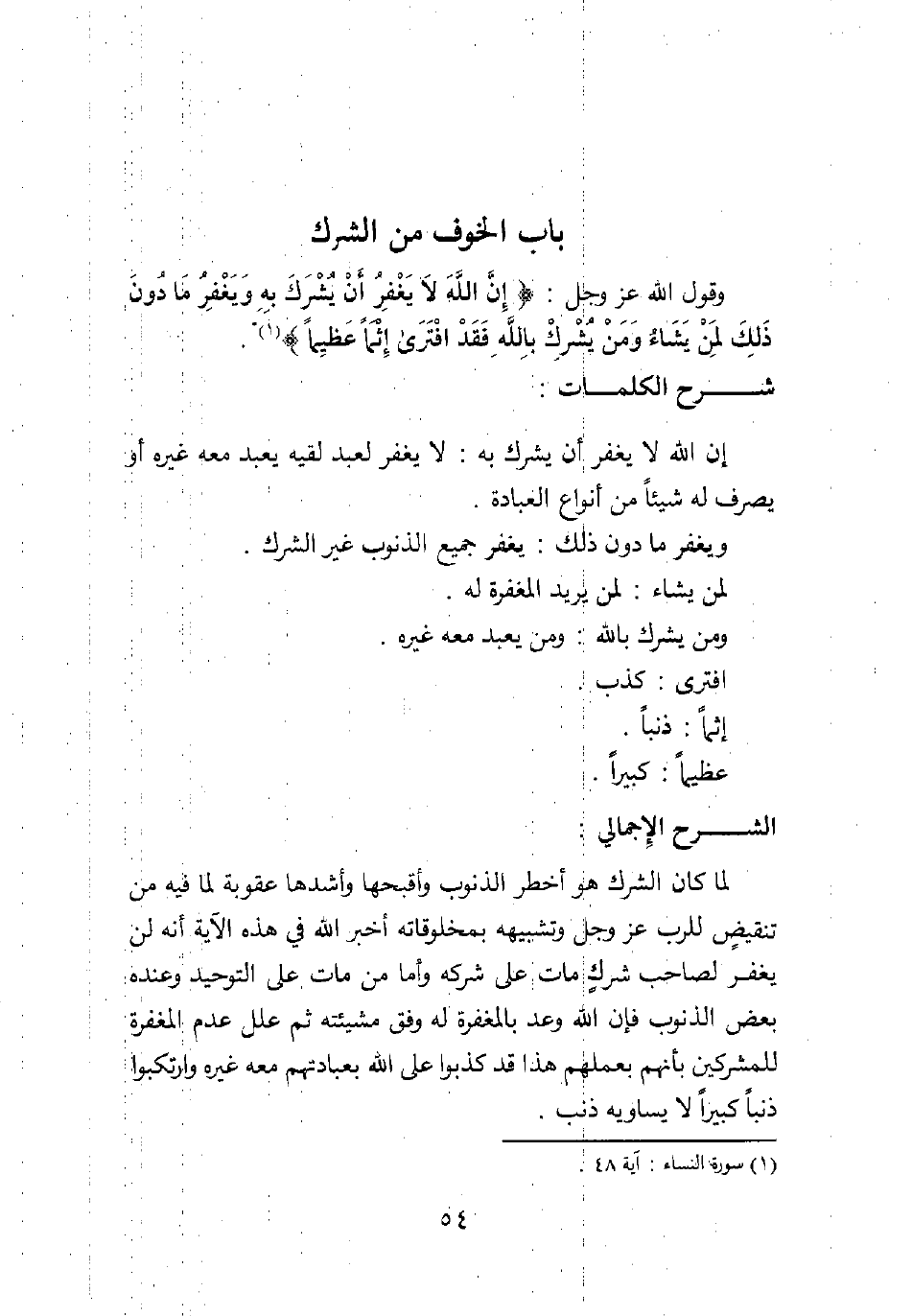 وقول الله عزوجل: {إِنَّ اللَّهَ لا يَغْفِرُ أَنْ يُشْرَكَ بِهِ وَيَغْفِرُ مَا دُونَ ذَلِكَ لِمَنْ يَشَاءُ وَمَنْ يُشْرِكْ بِاللَّهِ فَقَدِ افْتَرَى إِثْماً عَظِيماً} 1.