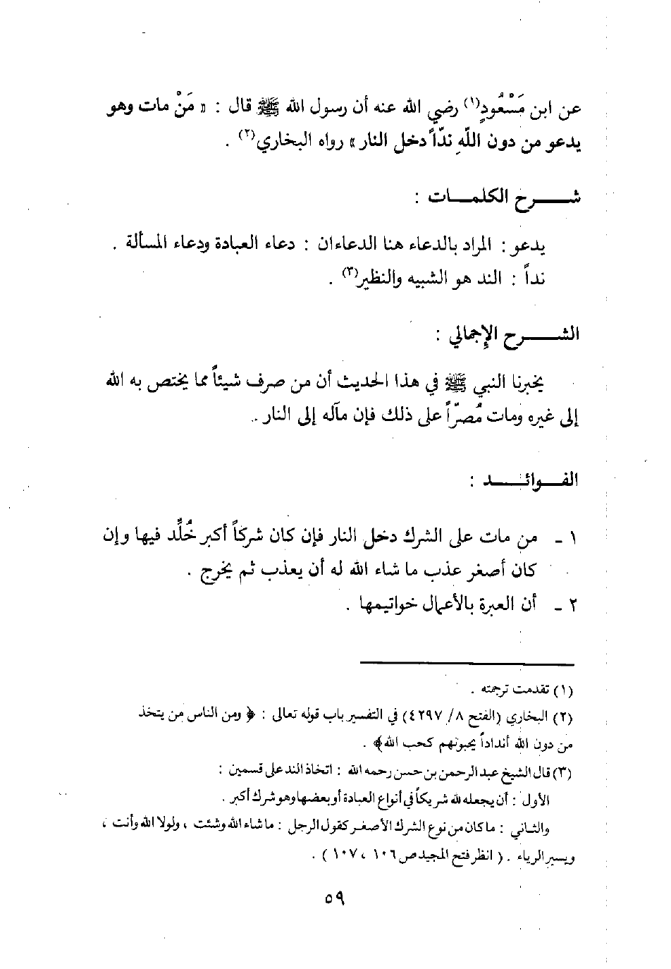 عن ابن مسعود1 رضي الله عنه أن رسول الله صلى الله عليه وسلم قال: " من مات وهو يدعو من دون الله ندا دخل النار ". رواه البخاري2.