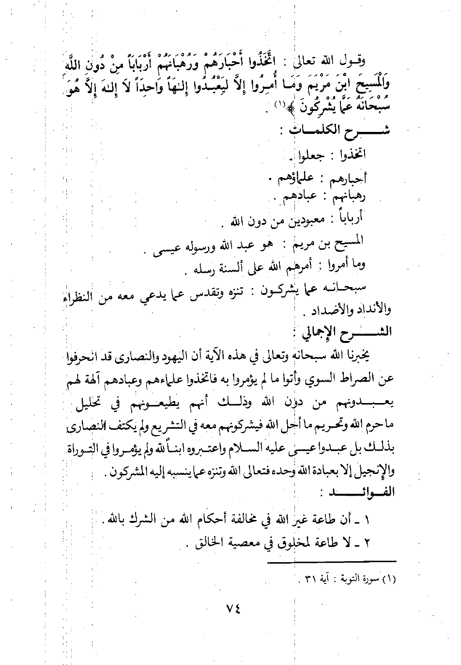 وقول الله تعالى: {اتَّخَذُوا أَحْبَارَهُمْ وَرُهْبَانَهُمْ أَرْبَاباً مِنْ دُونِ اللَّهِ وَالْمَسِيحَ ابْنَ مَرْيَمَ وَمَا أُمِرُوا إِلاَّ لِيَعْبُدُوا إِلَهاً وَاحِداً لا إِلَهَ إِلاَّ هُوَ سُبْحَانَهُ عَمَّا يُشْرِكُونَ} 1.