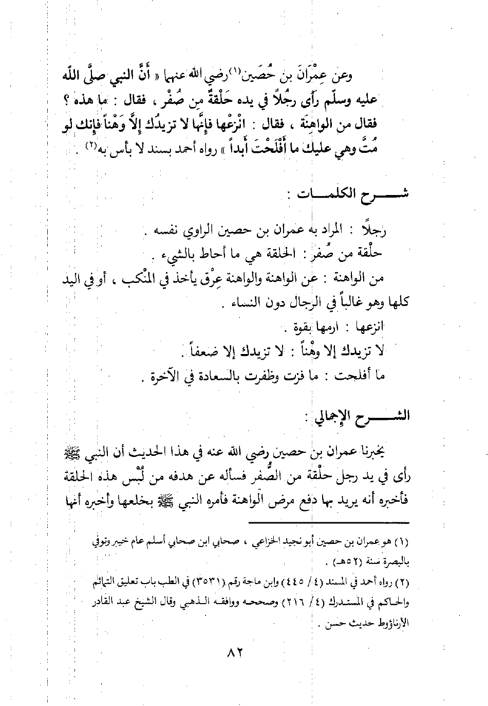 يخبرنا عمران بن حصين رضي الله عنهفي هذا الحديث أن النبي صلى الله عليه وسلم رأى في يد رجل حلقة من الصفر، فسأله عن هدفه من لبس هذه الحلقة فأخبره أنه يريد بها دفع مرض الواهنة، فأمره النبي صلى الله عليه وسلم بخلعها، وأخبره أنها