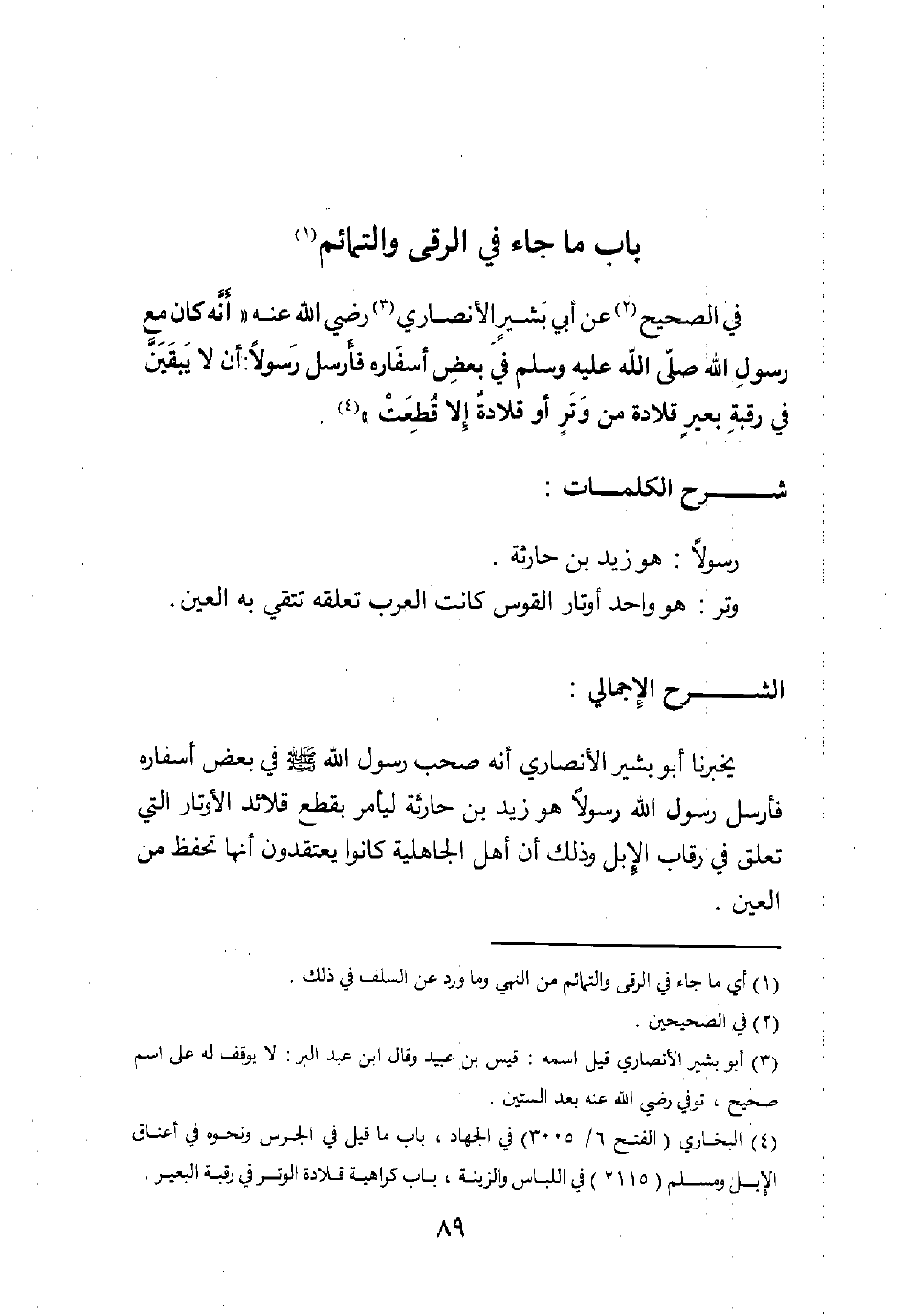 يخبرنا أبو بشير الأنصاري أنه صحب رسول الله صلى الله عليه وسلم في بعض أسفاره، فأرسل رسول الله رسولا هو زيد بن حارثة ليأمر بقطع قلائد الأوتار التي تعلق في رقاب الإبل، وذلك أن أهل الجاهلية كانوا يعتقدون أنها تحفظ من العين.