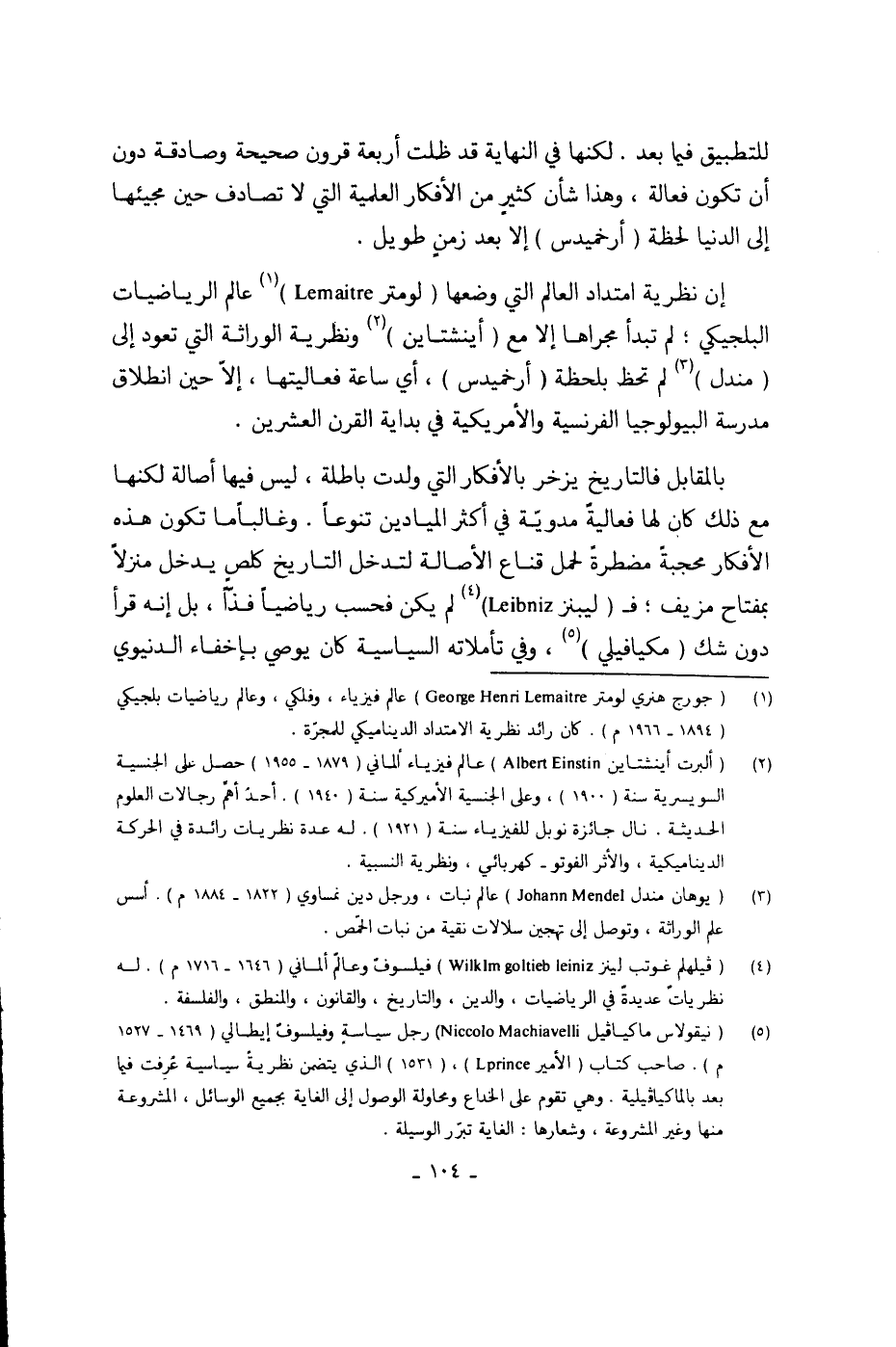 إن نظرية امتداد العالم التي وضعها (لومتر Lemaitre) (¬1) عالم الرياضيات البلجيكي؛ لم تبدأ مجراها إلا مع (أينشتاين) (¬2) ونظرية الوراثة التي تعود إلى (مندل) (¬3) لم تحظ بلحظة (أرخميدس)، أي ساعة فعاليتها، إلاّ حين انطلاق مدرسة البيولوجيا الفرنسية والأمريكية في بداية القرن العشرين.