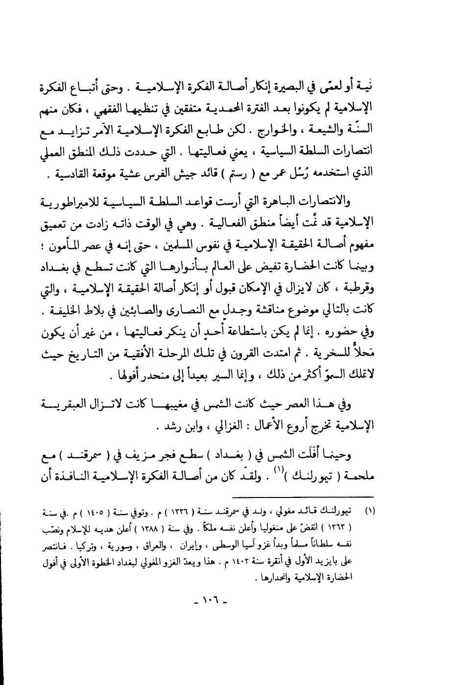 (¬1) تيمورلنك قائد مغولي، ولد في سمرقند سنة (1336) م. وتوفي سنة (1405) م. في سنة (1363) انقضّ على منغوليا وأعلن نفسه ملكاً. وفي سنة (1388) أعلن هديه للإسلام ونصّب نفسه سلطاناً مسلماً وبدأ غزو آسيا الوسطى، وإيران، والعراق، وسورية، وتركيا. فانتصر على بايزيد الأول في أنقرة سنة 1403م. هذا ويعدّ الغزو المغولي لبغداد الخطوة الأولى في أفول الحضارة الإسلامية وانحدارها.