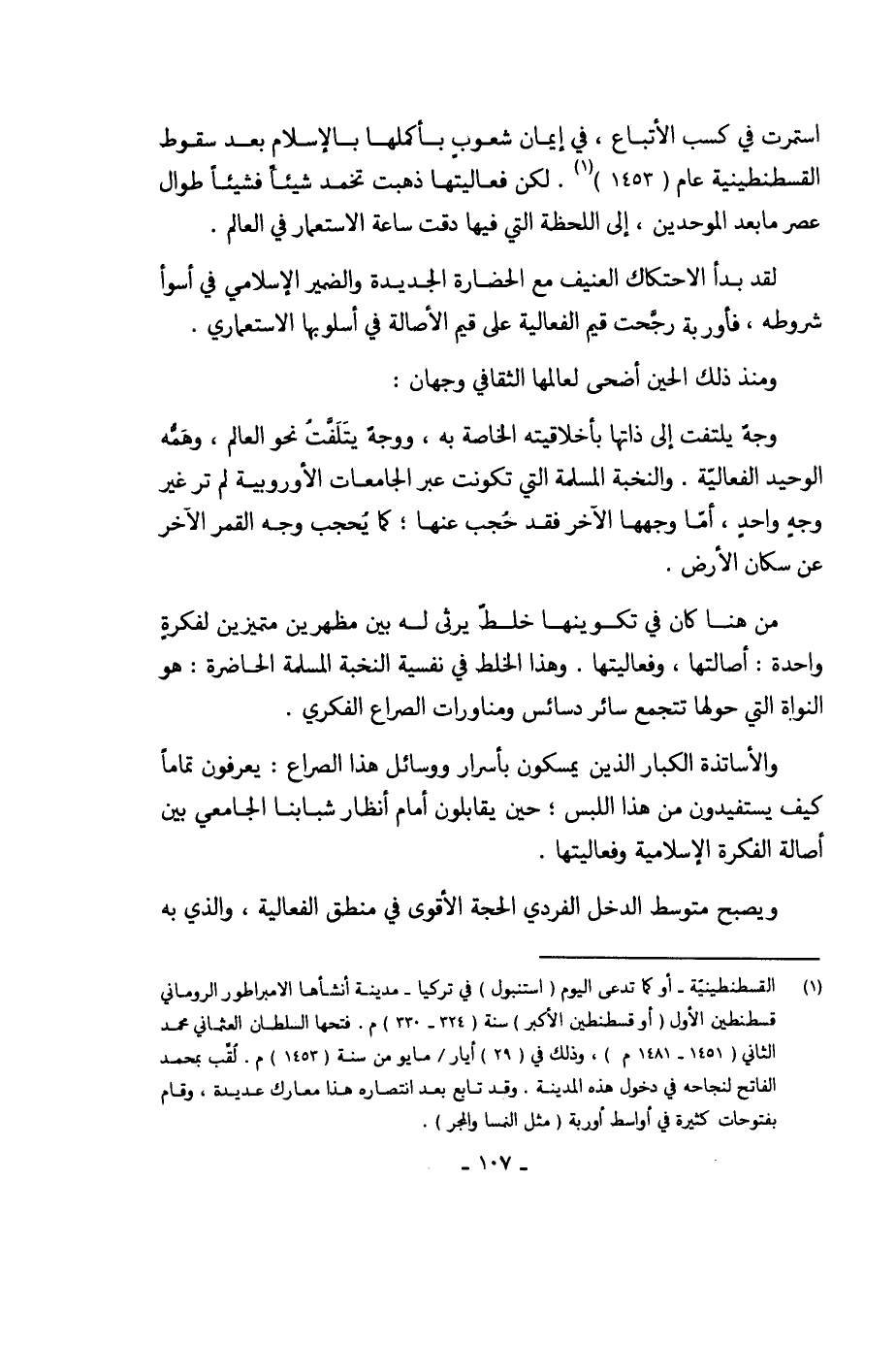 من هنا كان في تكوينها خلطٌ يرثي له بين مظهرين متميزين لفكرةٍ واحدة: أصالتها، وفعاليتها. وهذا الخلط في نفسية النخبة المسلمة الحاضرة: هو النواة التي حولها تتجمع سائر دسائس ومناورات الصراع الفكري.