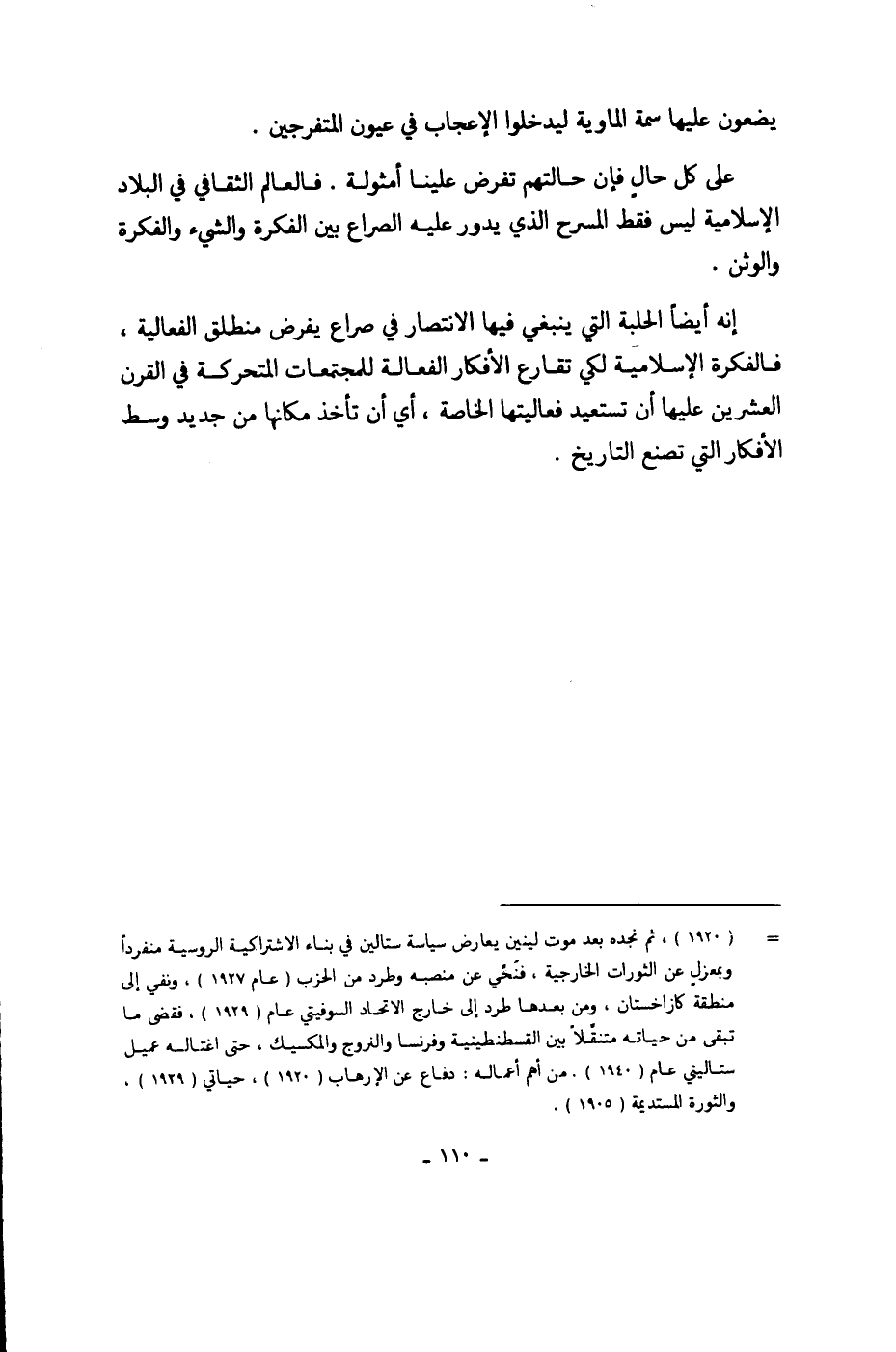 على كل حالي فإن حالتهم تفرض علينا أمثولة. فالعالم الثقافي في البلاد الإسلامية ليس فقط المسرح الذي يدور عليه الصراع بين الفكرة والشيء والفكرة والوثن.