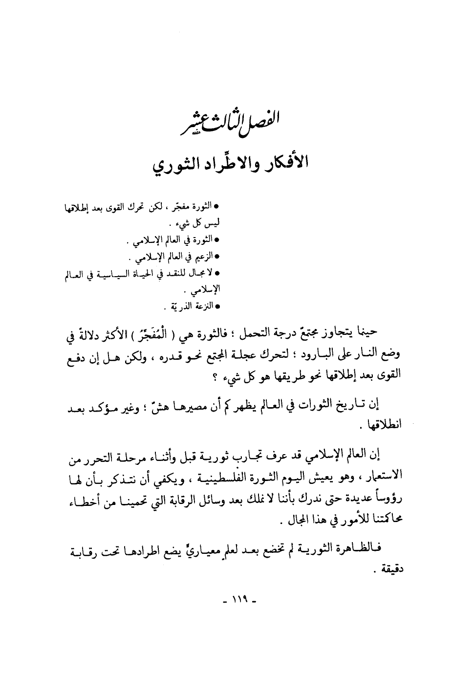 إن العالم الإسلامي قد عرف تجارب ثورية قبل وأثناء مرحلة التحرر من الاستعمار، وهو يعيش اليوم الثورة الفلسطينية، ويكفي أن نتذكر بأن لها رؤوساً عديدة حتى ندرك بأننا لا نملك بعد وسائل الرقابة التي تحمينا من أخطاء محاكمتنا للأمور في هذا المجال.