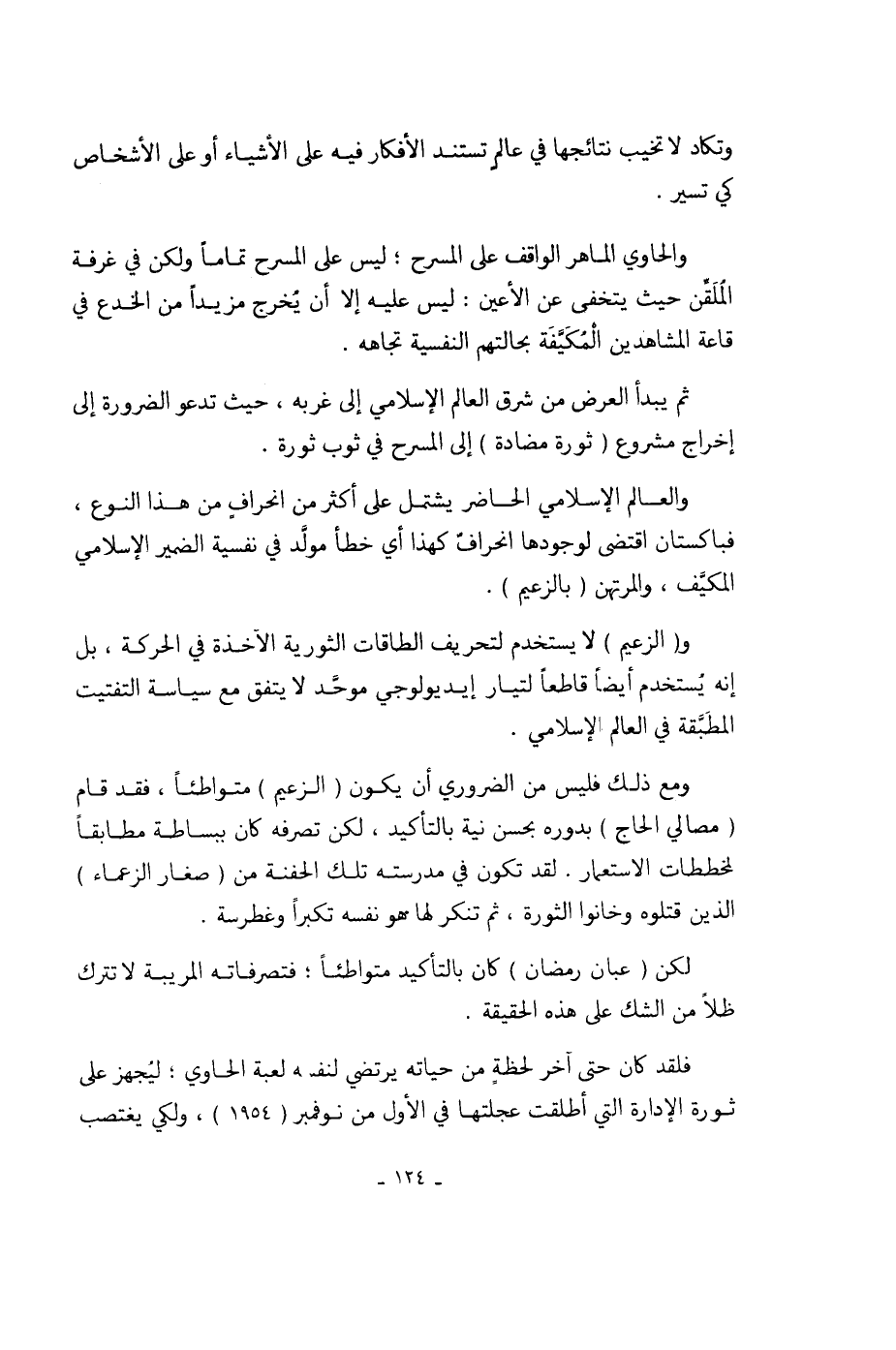 ومع ذلك فليس من الضروري أن يكون (الزعيم) متواطئاً، فقد قام (مصالي الحاج) بدوره بحسن نية بالتأكيد، لكن تصرفه كان ببساطة مطابقاً لمخططات الاستعمار. لقد تكون في مدرسته تلك الحفنة من (صغار الزعماء) الذين قتلوه وخانوا الثورة، ثم تنكر لها هو نفسه تكبراً وغطرسة.
