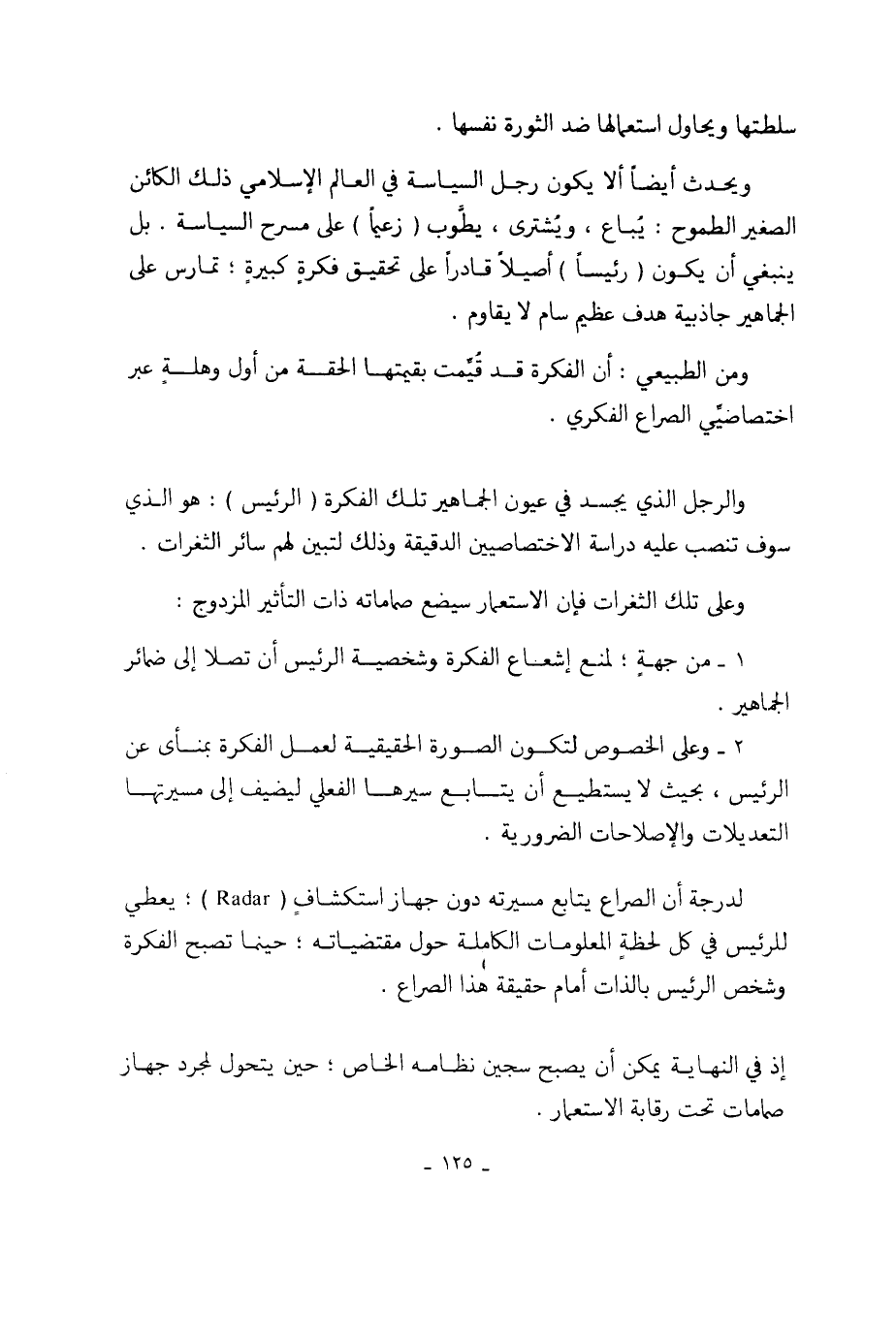 ويحدث أيضاً ألا يكون رجل السياسة في العالم الإسلامي ذلك الكائن الصغير الطموح: يُباع، ويُشترى، يطوب (زعيماً) على مسرح السياسة. بل ينبغي أن يكون (رئيساً) أصيلاً قادراً على تحقيق فكرة كبيرةٍ؛ تمارس على الجماهير جاذبية هدف عظيم سام لا يقاوم.
