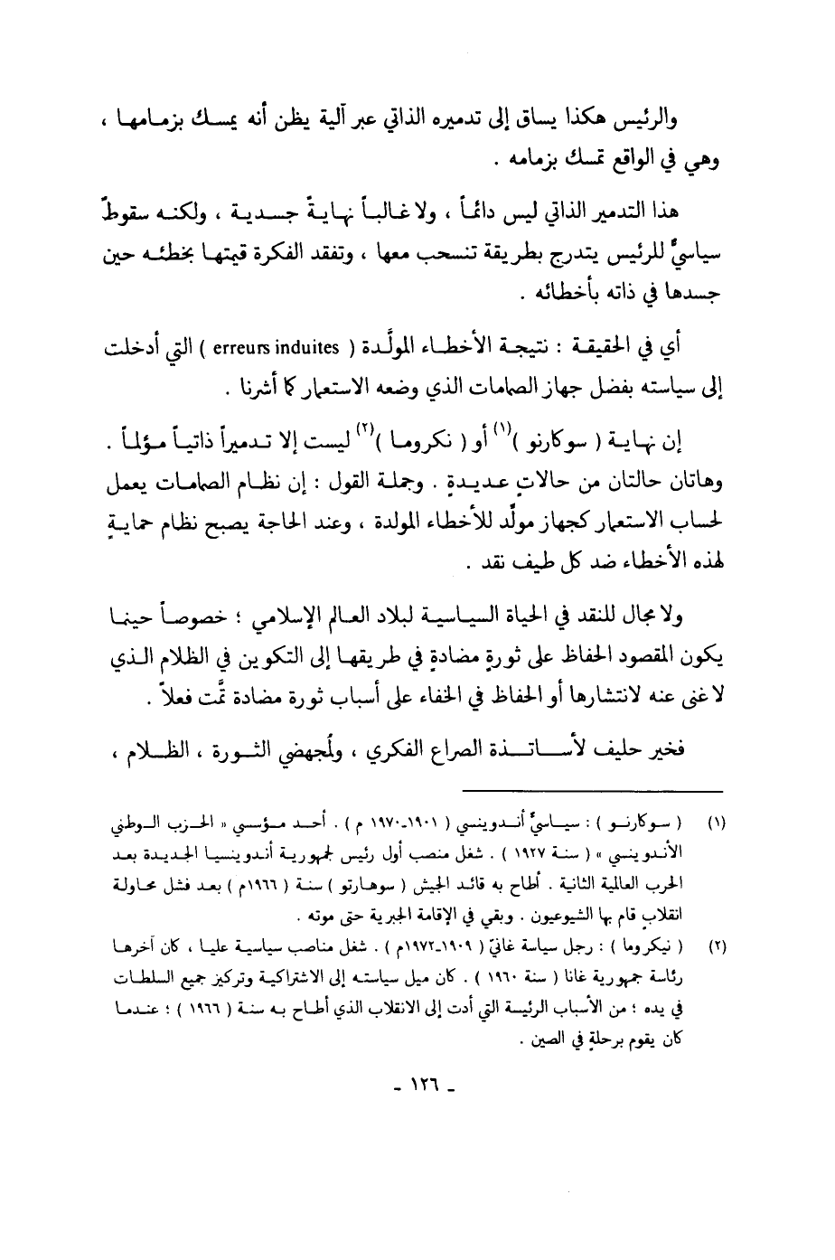 إن نهاية (سوكارنو) (¬1) أو (نكروما) (¬2) ليست إلا تدميراً ذاتياً مؤلماً. وهاتان حالتان من حالاتٍ عديدةٍ. وجملة القول: إن نظام الصمامات يعمل لحساب الاستعمار كجهاز مولِّد للأخطاء المولدة، وعند الحاجة يصبح نظام حمايةٍ لهذه الأخطاء ضد كل طيف نقد.
