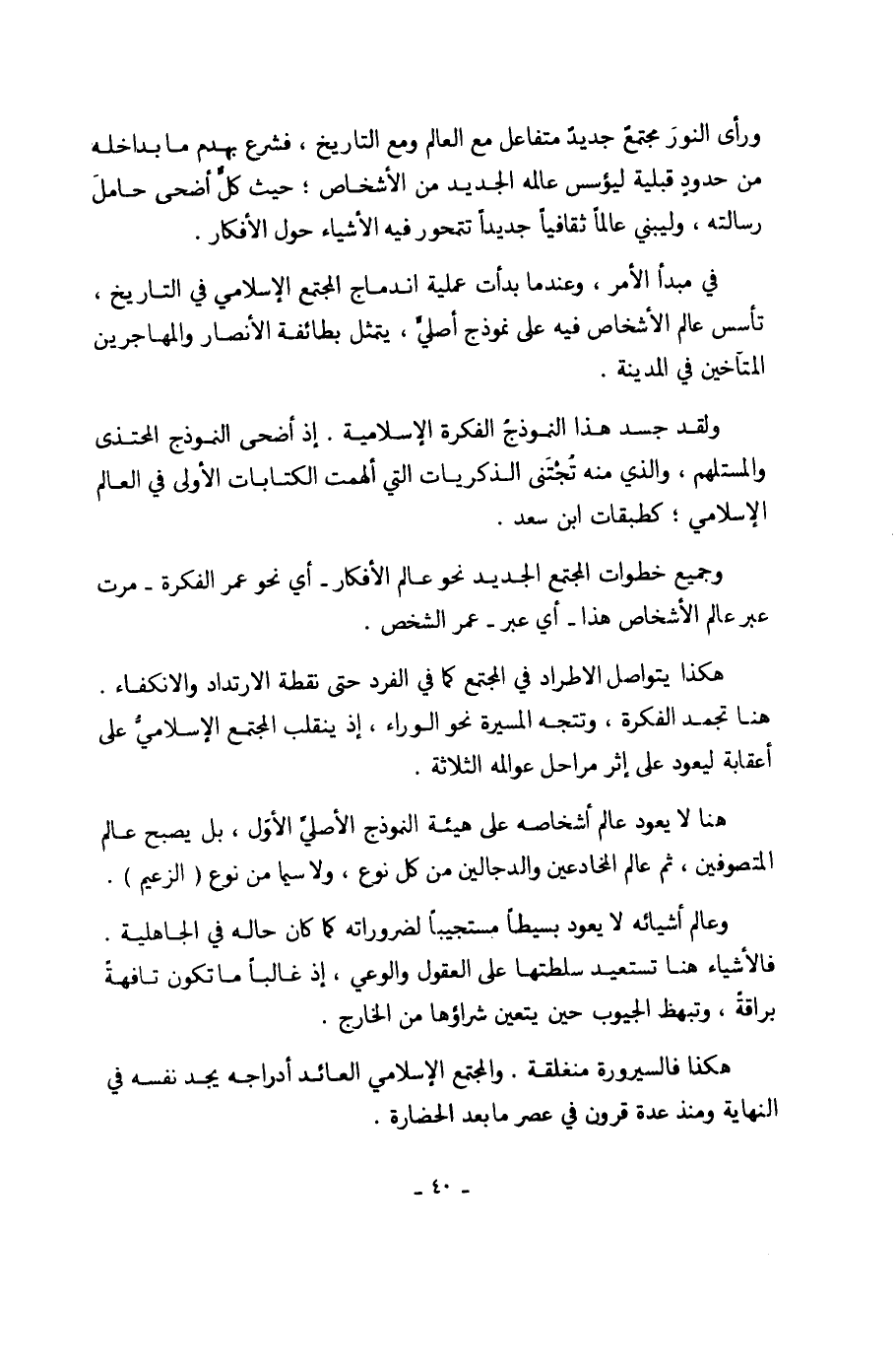 هكذا فالسيرورة منغلقة. والمجتمع الإسلامي العائد أدراجه يجد نفسه في النهاية ومنذ عدة قرون في عصر ما بعد الحضارة.
