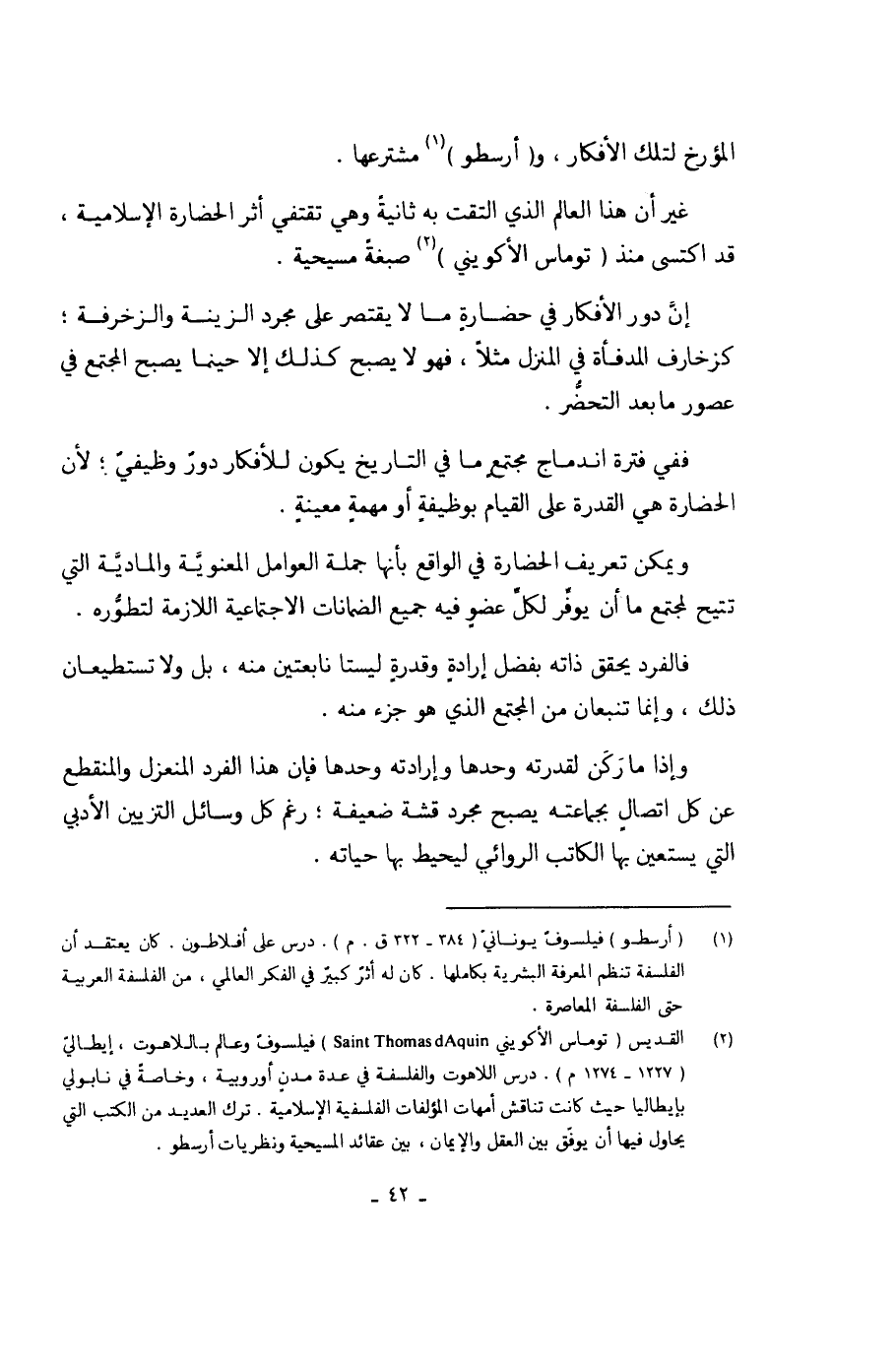 (¬2) القديس (توماس الأكويني Saint Thomas Aquin) فيلسوف ٌ وعالم باللاهوت، إيطاليّ (1227 - 1274م). درس اللاهوت والفلسفة في عدة مدنٍ أوروبية، وخاصةً في نابولي بإيطاليا حيث كانت تناقش أمهات المؤلفات الفلسفية الإسلامية. ترك العديد من الكتب التي يحاول فيها أن يوفّق بين العقل والإيمان، بين عقائد المسيحية ونظريات أرسطو.