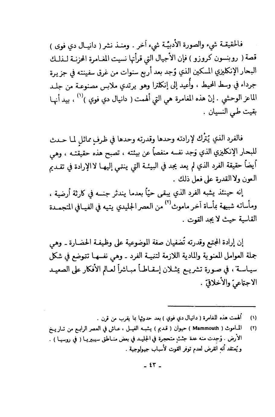 إنه حينئذ يشبه الفرد الذي يبقى حيّاً بعدما يندثر جنسه في كارثة أرضية، ومأساته شبيهة بمأساة آخر ماموث (¬2) من العصر الجليدي يتيه في الفيافي المتجمدة القاسية حيث لا يجد القوت.