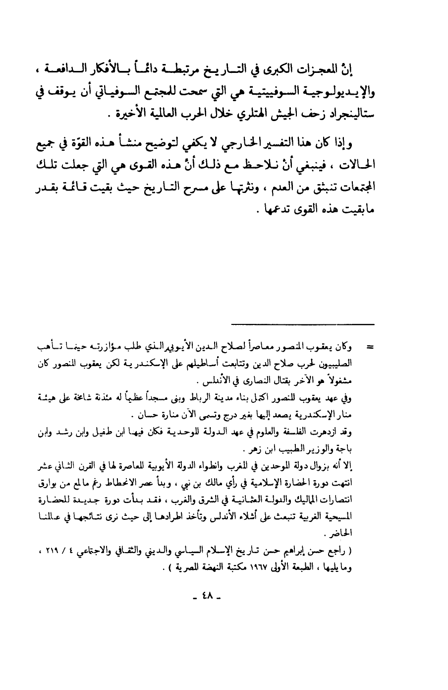 وإذا كان هذا التفسير الخارجي لا يكفي لتوضيح منشأ هذه القوّة في جميع الحالات، فينبغي أنْ نلاحظ مع ذلك أن هذه القوى هي التي جعلت تلك المجتمعات تنبثق من العدم، ونثرتها على مسرح التاريخ حيث بقيت قائمة بقدر ما بقيت هذه القوى تدعمها.