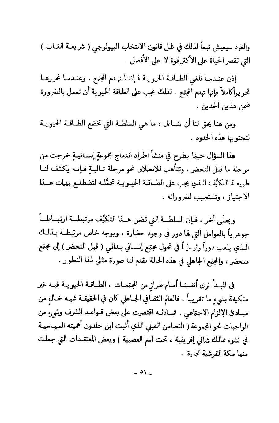 وبمعنًى آخر، فإن السلطة التي تضمن هذا التكيُّف مرتبطة ارتباطاً جوهرياً بالعوامل التي لها دور في وجود حضارة، وبوجه خاص مرتبطة بذلك الذي يلعب دورًا رئيسيّاً في تحول مجتمع إنساني بدائي (قبل التحضر) إلى مجتمع متحضر، والمجتمع الجاهلي في هذه الحالة يقدم لنا صورة مثلى لهذا التطور.