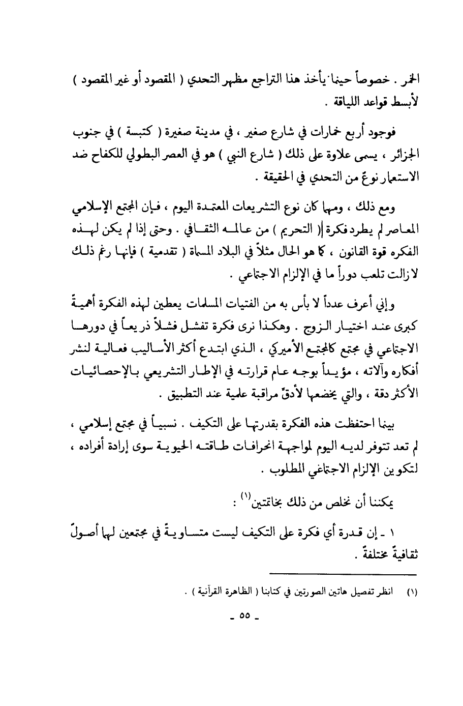 بينما احتفظت هذه الفكرة بقدرتها على التكيف، نسبياً في مجتمع إسلامي، لم تعد تتوفر لديه اليوم لمواجهة انحرافات طاقته الحيوية سوى إرادة أفراده، لتكوين الإلزام الاجتماعي المطلوب.
