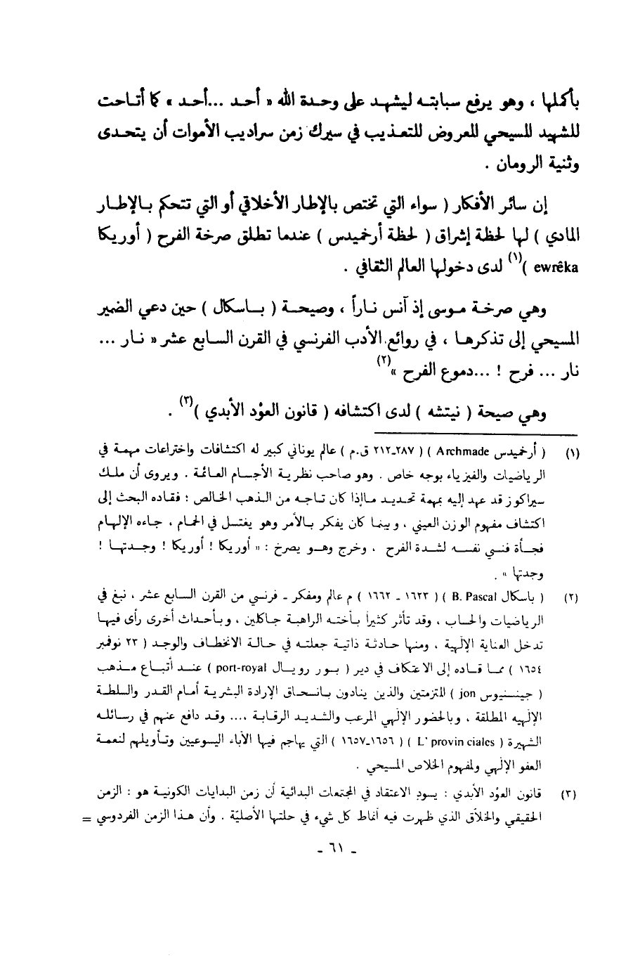 وهي صرخة موسى إذ آنس ناراً، وصيحة (باسكال) حين دعي الضمير المسيحي إلى تذكرها، في روائع الأدب الفرنسي في القرن السابع عشر ((نار ... نار ... فرح! ... دموع الفرح)) (¬2)