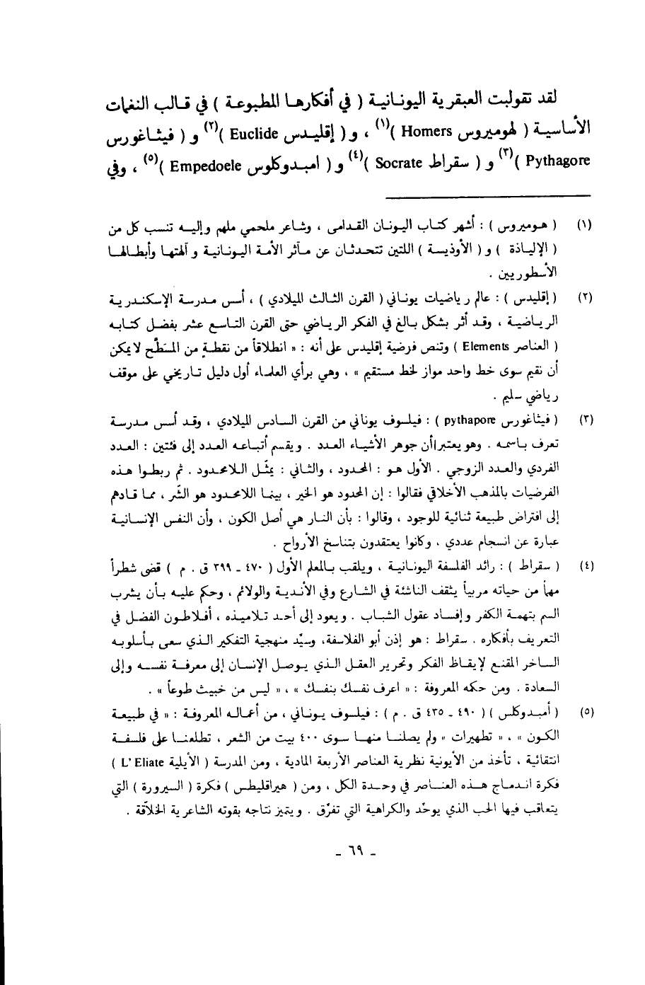 لقد تقولبت العبقرية اليونانية (في أفكار ها المطبوعة) في قالب النغمات الأساسية (لهوميروس Homers) (¬1) ، و (إقليدس Euclide) (¬2) و (فيثاغورس Pythagore) (¬3) و (سقراط Socrate) (¬4) و (امبدوكلوس Empedoele) (¬5) ، وفي