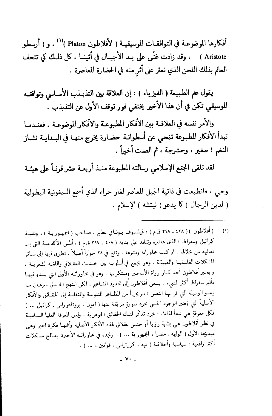 أفكار ها الموضوعة في التوافقات الموسيقية (لأفلاطون Platon) (¬1) ، و (أرسطو Aristote) ، وقد زادت غنًى على يد الأجيال في أثينا، كل ذلك كي تتحف العالم بذلك اللحن الذي نعثر على أثرٍ منه في الحضارة المعاصرة.
