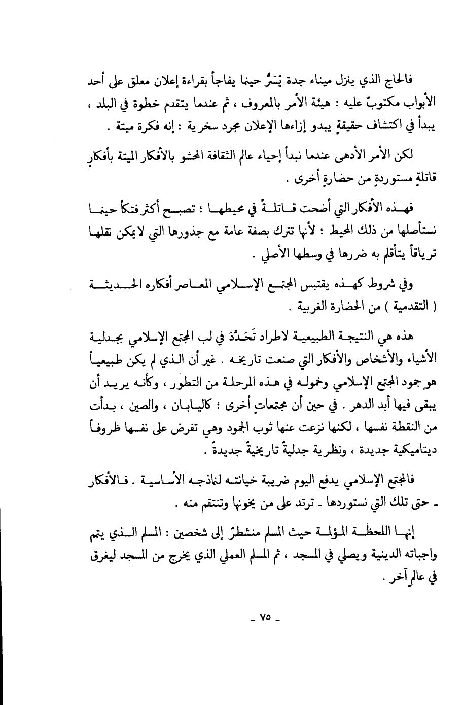 إنها اللحظة المؤلمة حيث المسلم منشطرٌ إلى شخصين: المسلم الذي يتمم واجباته الدينية ويصلي في المسجد، ثم المسلم العملي الذي يخرج من المسجد ليغرق في عالمٍ آخر.