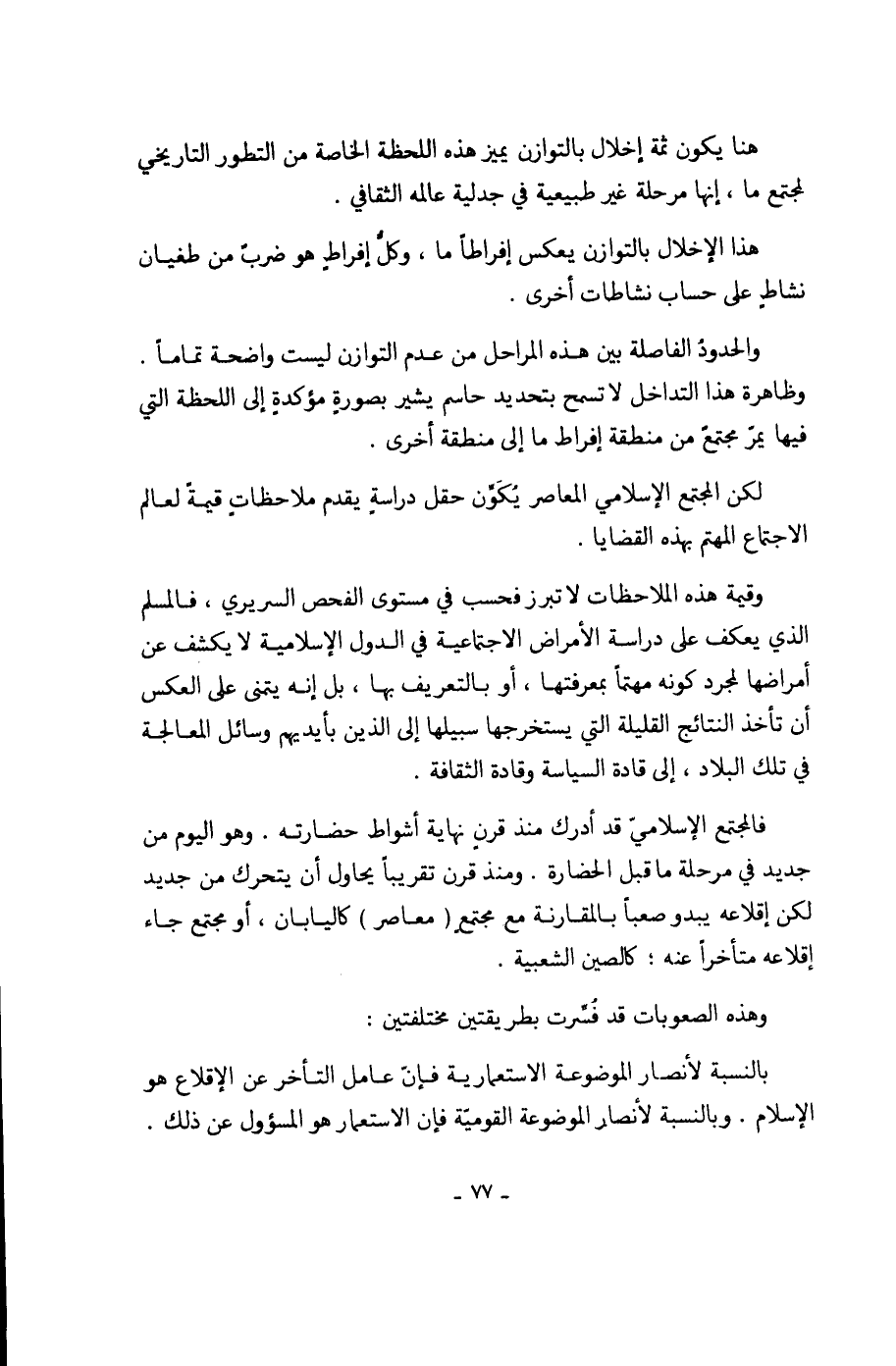 فالمجتع الإسلاميّ قد أدرك منذ قرنٍ نهاية أشواط حضارته. وهو اليوم من جديد في مرحلة ما قبل الحضارة. ومنذ قرن تقريباً يحاول أن يتحرك من جديد لكن إقلاعه يبدو صعباً بالمقارنة مع مجتمعٍ (معاصر) كاليابان، أو مجتمع جاء إقلاعه متأخراً عنه؛ كالصين الشعبية.