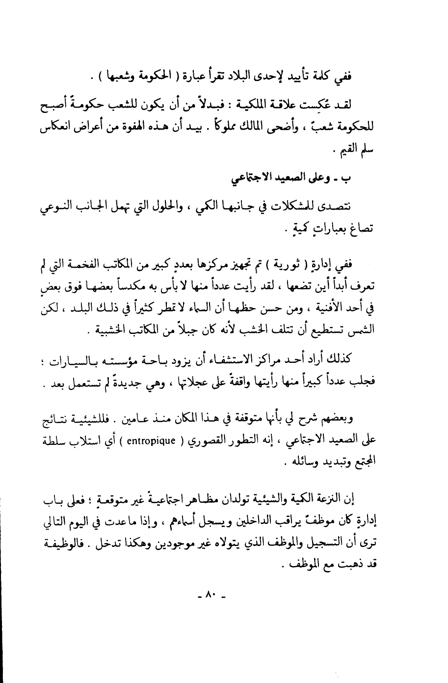 وبعضهم شرح لي بأنها متوقفة في هذا المكان منذ عامين. فللشيئية نتائج على الصعيد الاجتماعي، إنه التطور القصوري ( entropique) أي استلاب سلطة المجتمع وتبديد وسائله.