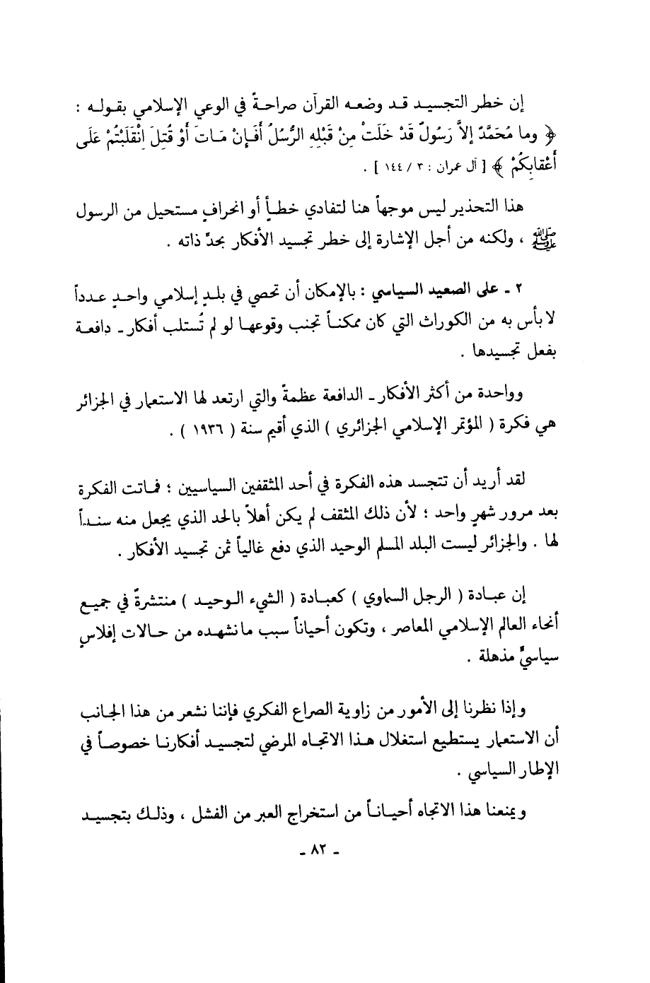 لقد أريد أن تتجسد هذه الفكرة في أحد المثقفين السياسيين؛ فماتت الفكرة بعد مرور شهرٍ واحد؛ لأن ذلك المثقف لم يكن أهلاً بالحد الذي يجعل منه سنداً لها. والجزائر ليست البلد المسلم الوحيد الذي دفع غالياً ثمن تجسيد الأفكار.