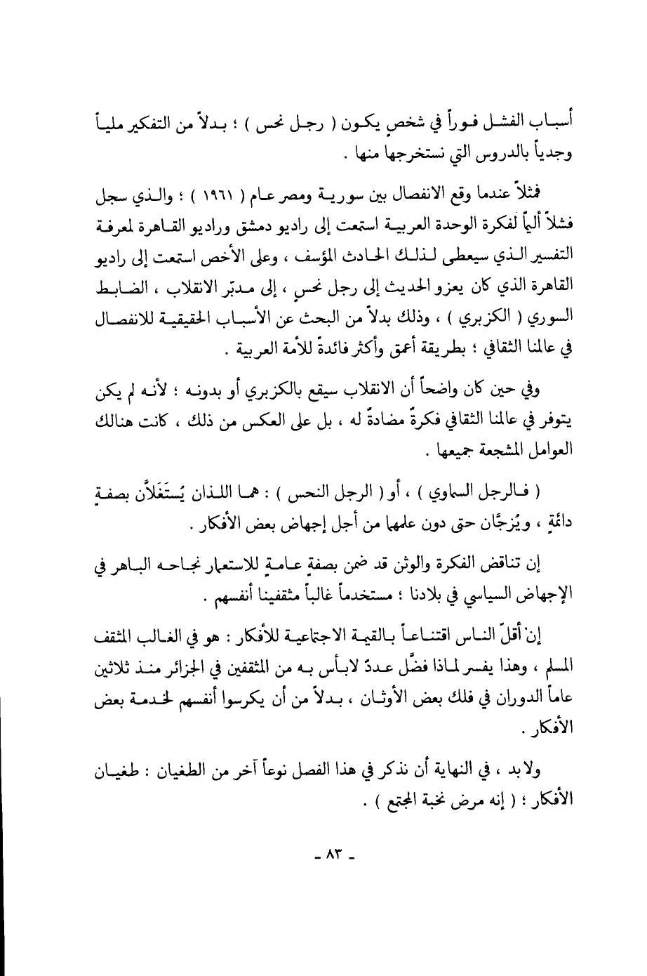 إن أقلّ الناس اقتناعاً بالقيمة الاجتماعية للأفكار: هو في الغالب المثقف المسلم، وهذا يفسر لماذا فضَّل عددٌ لا بأس به من المثقفين في الجزائر منذ ثلاثين عاماً الدوران في فلك بعض الأوثان، بدلاً من أن يكرسوا أنفسهم لخدمة بعض الأفكار.