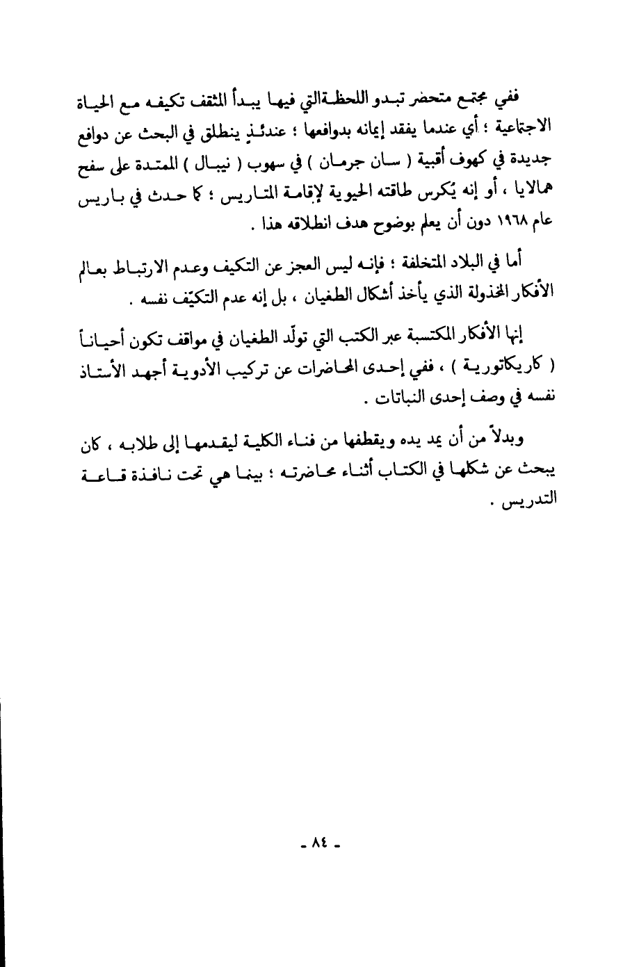 ففي مجتمع متحضر تبدو اللحظة التي فيها يبدأ المثقف تكيفه مع الحياة الاجتماعية؛ أي عندما يفقد إيمانه بدوافعها؛ عندئذ ينطلق في البحث عن دوافع جديدة في كهوف أقبية (سان جرمان) في سهوب (نيبال) الممتدة على سفح همالايا، أو إنه يُكرس طاقته الحيوية لإقامة المتاريس؛ كما حدث في باريس عام 1968 دون أن يعلم بوضوح هدف انطلاقه هذا.