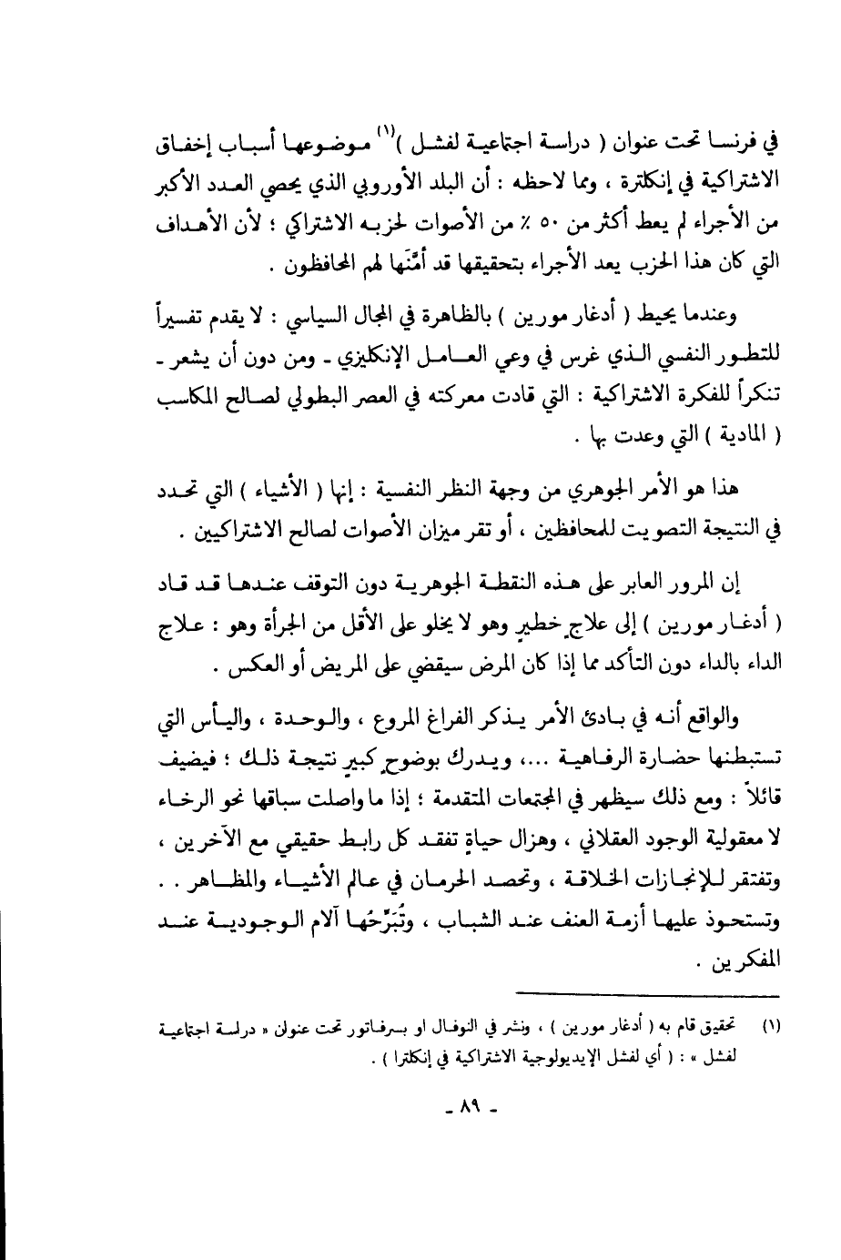 وعندما يحيط (أدغار مورين) بالظاهرة في المجال السياسي: لا يقدم تفسيراً للتطور النفسي الذي غرس في وعي العامل الإنكليزي- ومن دون أن يشعر- تنكرًا للفكرة الاشتراكية: التي قادت معركته في العصر البطولي لصالح المكاسب (المادية) التي وعدت بها.