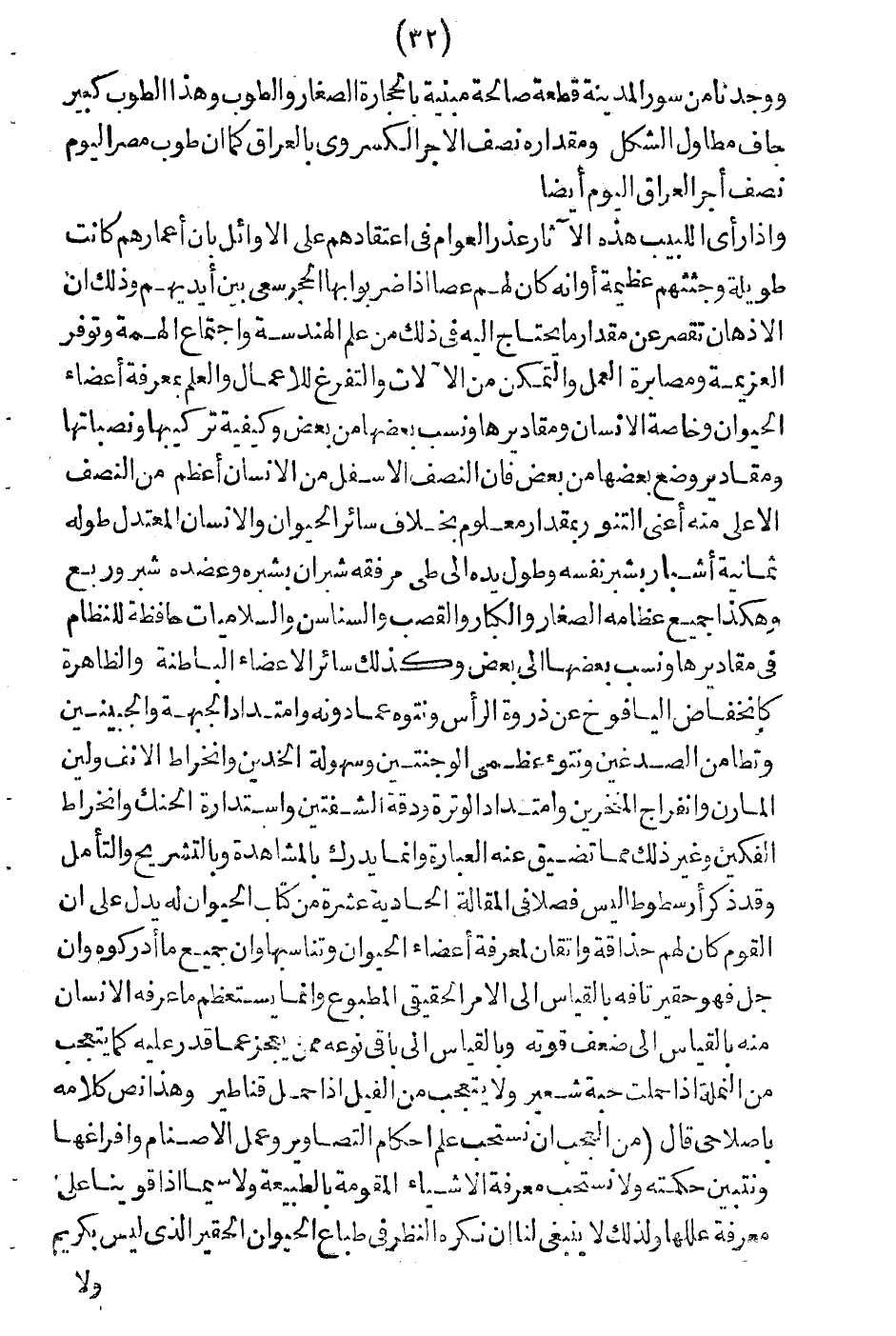 وإذا رأى اللبيب هذه الآثار عذر العوامّ في اعتقادهم عن الأوائل بأنّ أعمارهم كانت طويلة وجثثهم عظيمة أو أنّه كان لهم عصاً إذا ضربوا بها الحجر سعى بين أيديهم، وذلك أنّ الأذهان تقصُر عن مِقدار ما يُحتاجُ إليه في ذلك من علم الهندسية واجتماع الهمّة وتوفّر العزيمة ومصابرةِ العمل والتمكّنِ مِن الآلات والتفرُّغ للأعمال والعلم بمعرفة أعضاء الحيوان وخاصّة الإنسان ومقاديرها، ونسب بعضها من بعض، وكيفية تركيبها ونصباتها ومقادير وضع بعضها من بعض، فإن النصف الأسفل من الإنسان أعظم من النصف الأعلى منه أعني التنوُّر بمقدارٍ معلوم، بخلاف سائر الحيوان، والإنسان المعتدل طوله ثمانية أشبارٍ بشبر نفسِه وطول يده إلى طيِّ مرفقه شبران بشبره وعضده شبر وربع وهكذا جميعُ عظام الصغار والكبار والقصب والسناش والسلاميات حافظة للنظام في مقاديرها ونِسَب بعضها إلى بعض، وكذلك سائر الأعضاء الباطنة والظاهرة كانخفاض اليافوخ عن ذروة الرأس ونتوئه عمّا دونه، وامتداد الجبهة والجبينين وتطامن الصدغين، ونتوء عظمي الوجنتين وسهولة الخدين، وانخراط الأنف ولين المارن وانفراج المنخرين، وامتداد الوتر ودقة الشفتين واستدارة الحبك وانخراط الفكين، وغير ذلك ممّا تضيقُ عنهُ العبارة، وإنما يُدرك بالمشاهدة وبالتشريح والتأمُّل، وقد ذكر أرسطوطاليس فصلاً في المقالةِ الحادية عشرة من كتاب الحيوان له، يدل على أنّ القوم كان لهم حَذاقةٌ وإتقان لمعرفة أعضاء الحيوان وتناسبها، وأنَّ جميع ما