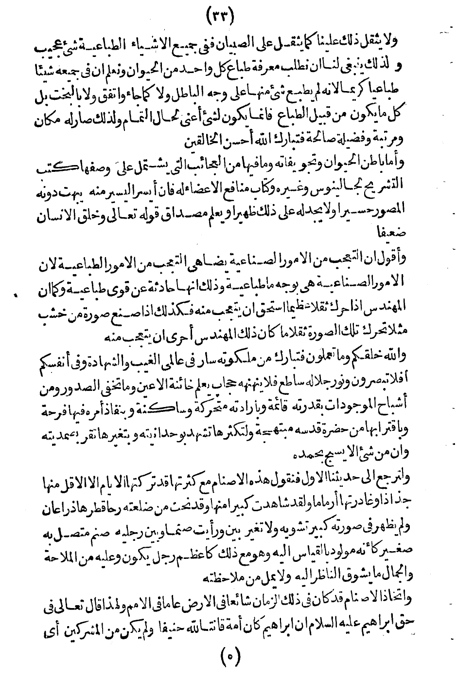 ولا يثقل ذلك علينا كما يثقل على الصبيان، ففي جميع الأشياء الطباعية شيءٌ عجيبٌ، ولذلك ينبغي لنا أن نطلب معرفة طباع كلِّ واحدٍ من الحيوان ونعلم أنّ في جميعه شيئا طباعياً كريماً، لأنّه لم يطبع شيء منها على وجه الباطل ولا كما جاء واتّفق ولا بالبخت، بل كل ما يكون من قبيل الطِّباع قائماً، يكون لشيء أعنى لحال التمام، ولذلك صار له مكان ومرتبة وفضيلة صالحة، فتبارك الله أحسن الخالقين!!