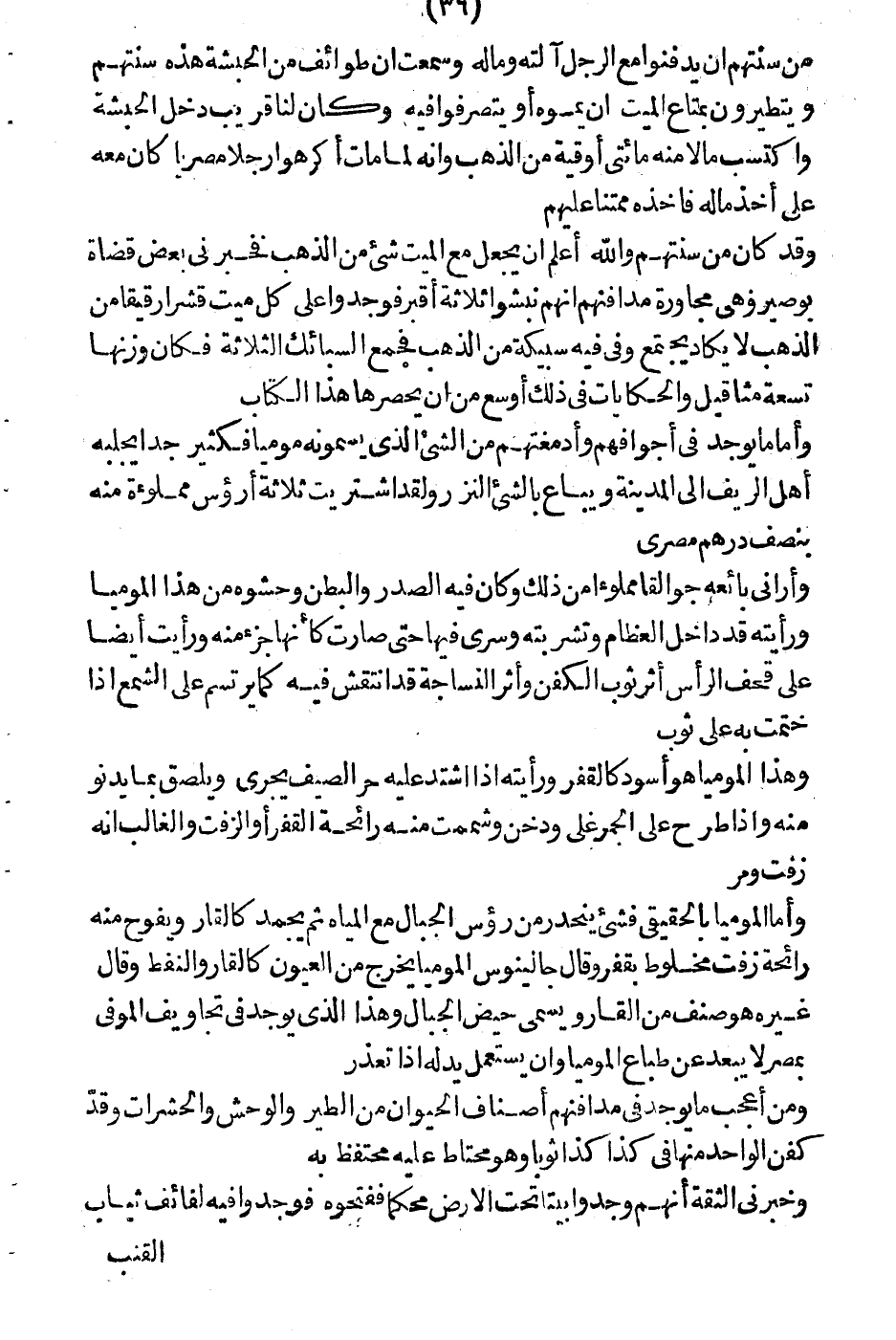وأما ما يوجد في أجوافهم وأدمغتهم من الشيء الذي يسمونه موميا فكثير جدا، يجلبه أهل الريف إلى المدينة ويُباع بالشيء النزر ولقد اشتريت ثلاثة رؤوس مملوءة منه بنصف درهم مصري.