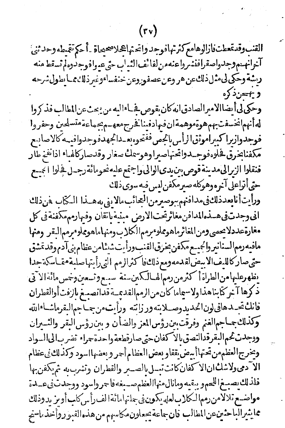 الغنم وفرَّقت بين رؤوس المعز والضأن وبين رؤوس البقر والثيران، ووجدت لحم البقر قد التصق بالأكفان حتى صار قطعة واحدة حمراء تقرب إلى السواد، ويخرج العَظم من تحتها أبيض وبعض العظام أحمر وبعضها أسود، وكذلك في عظام الآدمي، ولا شكّ في أنّ الأكفان كانت تُبلُّ بالصبر والقطران وتُشرَّبُ به ثم يكفن بها فلذلك يُصبغ اللحم ويبقيه وما نال منها العظم صبغته فاحمرّ واسودّ، ووجدت في عدة مواضع تلالاً من رمم الكلاب لعله يكون في جملتها مائة ألف رأس كلب أو يزيد وذلك مما يثير الباحثين عن المطالب، فإنّ جماعة يجعلون مكاسبهم من هذه القبور وأخذِ ما سنحَ