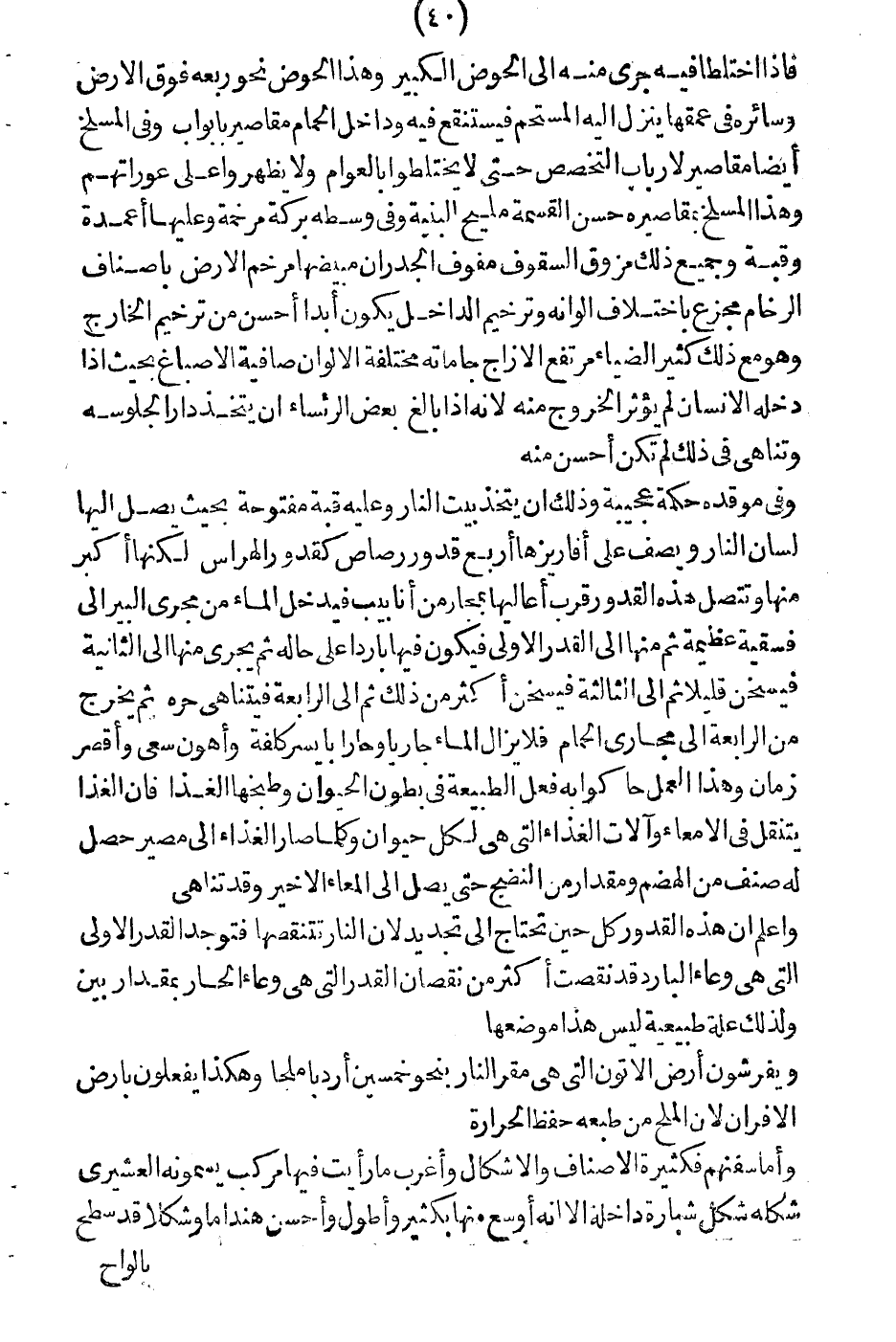أكبر منها، وتتصل هذه القدور قرب أعاليها بمجارٍ من أنابيب، فيدخل الماء من مجرى البير إلى فسقية عظيمة، ثم منها إلى القدر الأولى فيكون فيها باردا على حاله ثم يجري منها إلى الثانية فيسخن قليلا، ثم إلى الثالثة فيسخن أكثر من ذلك ثم إلى الرابعة فيتناهى حره، ثم يخرج من الرابعة إلى مجاري الحمام فلا يزال الماء جاريا وحارا بأيسر كلفة وأهون سعي وأقصر زمان وهذا العمل حاكوا به فعل الطبيعة في بطون الحيوان وطبخها الغذاء، فإن الغذاء يتنقل في الأمعاء وآلات الغذاء التي هي لكلِّ حيوان، وكلما صار الغذاء إلى مصير، حصل على صنفٍ من الهضم ومقدارٍ من النضج حتى يصل إلى المعاء الأخير وقد تناهى.