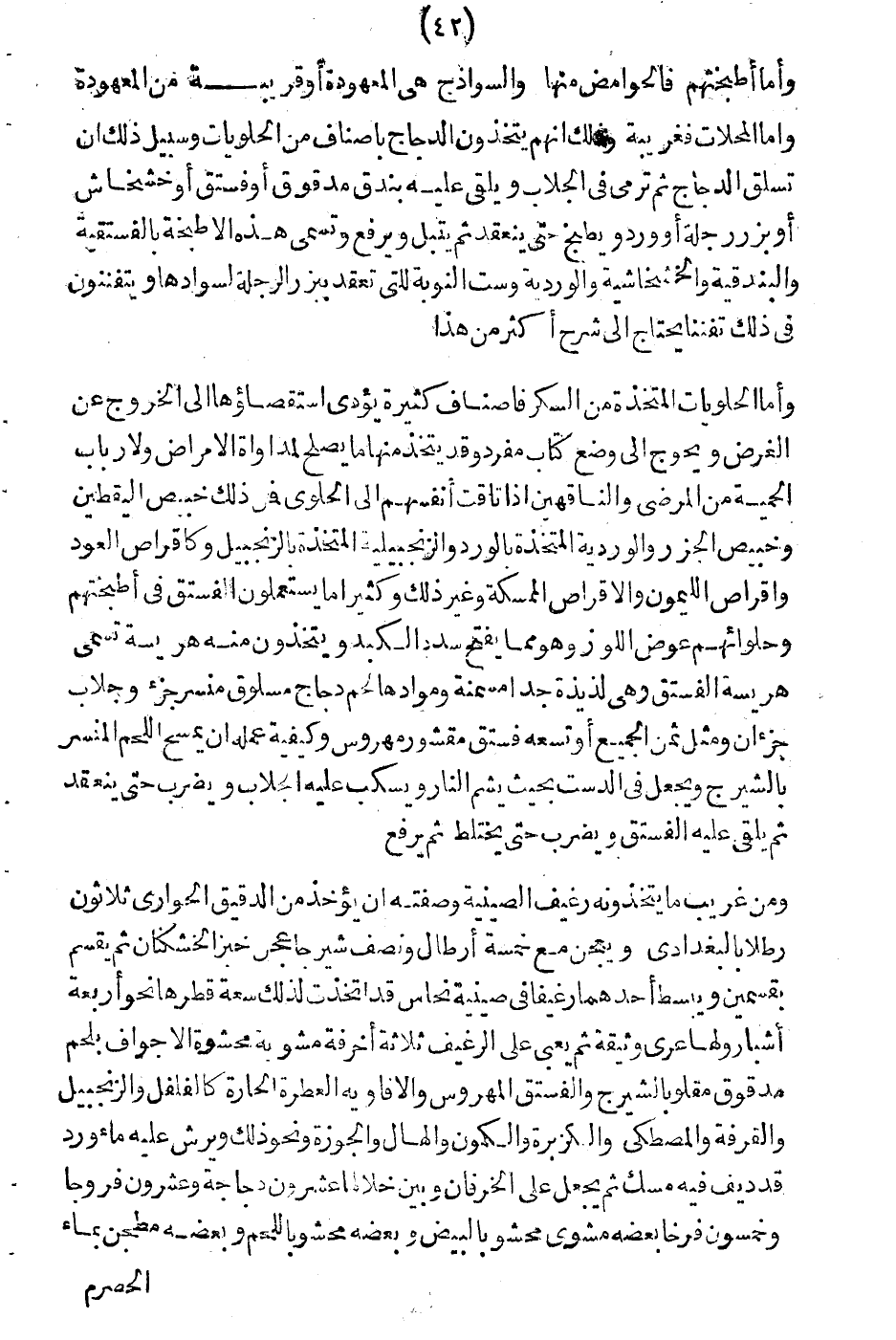 وأما أطبختهم فالحوامض منها والسواذج هي المعهودة أو قريبة من المعهودة، وأما المُحلّيات فغريبة وذلك أنهم يتخذون الدجاج بأصناف من الحلويات، وسبيل ذلك