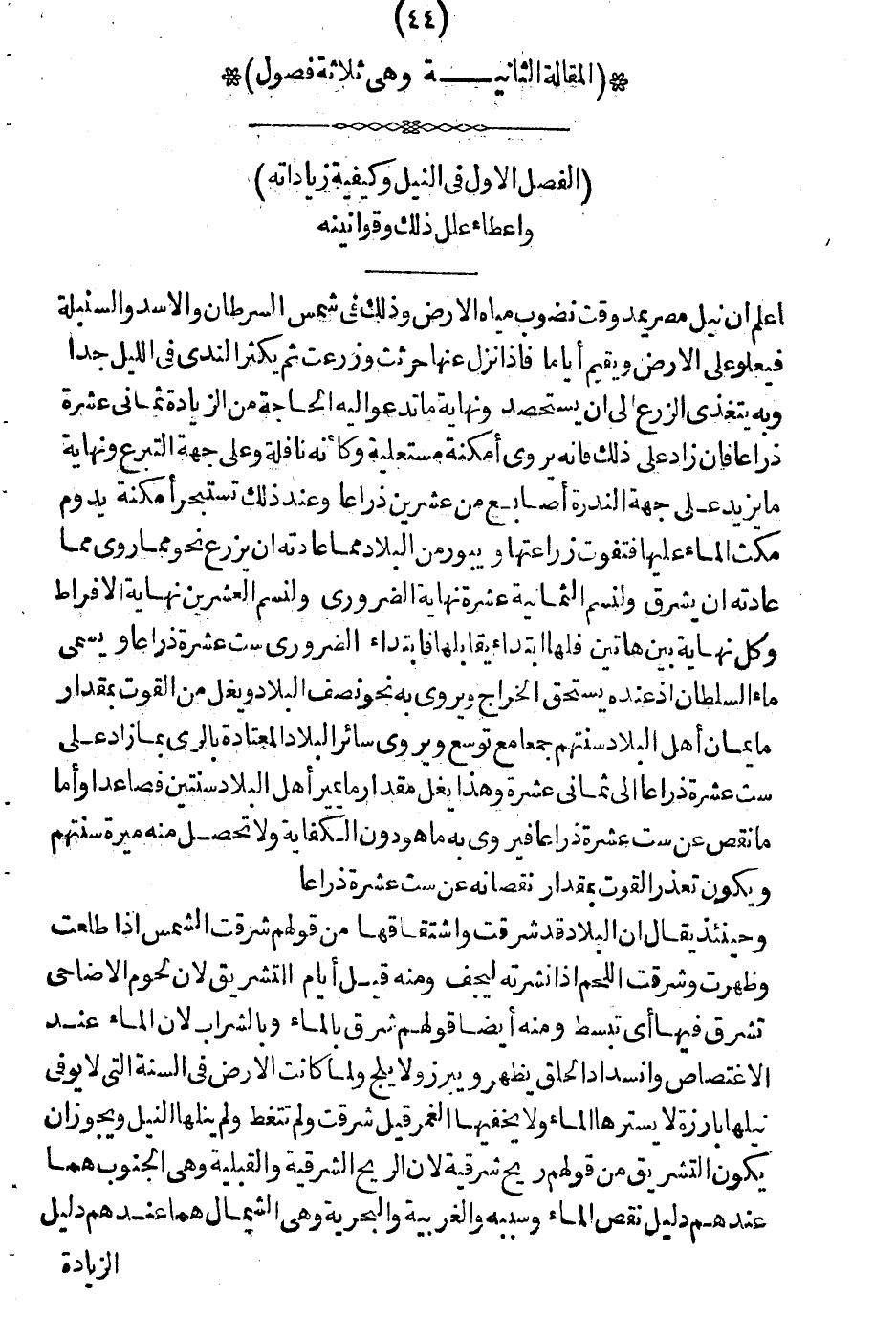 اعلم أن نيل مصر يمد وقت نضوب مياه الأرض وذلك في شمس السرطان والأسد السنبلة، فيعلو على الأرض ويقيم أياما فإذا نزل عنها حُرثت وزُرعت، ثم يكثر الندى في الليل جدا وبه يتغذّى الزرع إلى أن يُحصد، ونهاية ما تدعو إليه الحاجة من الزيادة ثماني عشرة ذراعا فإن زاد على ذلك، فإنه يروي أمكنة مستعلية وكأنه نافلة، وعلى جهة التبرع ونهاية ما يزيد على جهة الندرة أصابع من عشرين ذراعا وعند ذلك تَستبحر أمكنة يدوم مكثُ الماء عليها، فتفوت زراعتها ويبور من البلاد مما عادته أن يُزرع نحو مما روى مما عاداته أن يشرق، ولنسم الثماني عشرة نهاية الضروري ولنسم العشرين نهاية الإفراط وكل نهاية بين هاتين فلهما ابتداء يقابلها، فابتداء الضروري ست عشرة ذراعا ويسمى ماء السرطان، إذ عنده يستحق الخَراج ويدوي به نحو نصف البلاد ويغل من القوت بمقدار ما يحان أهل البلاد سننهم جمعا مع توسع ويروي سائر البلاد المعتادة بالري بما زاد على ست عشرة ذراعا إلى ثماني عشرة، وهذا يقل بمقدار ما يمير أهل البلاد سنتين فصاعدا، وأما ما نقص عن ست عشرة ذراعا فيروي به ما هو دون الكفاية ولا تحصل منه ميرة سنتهم، ويكون تعذّر القوت بمقدار نقصانه عن ست عشرة ذراعا.