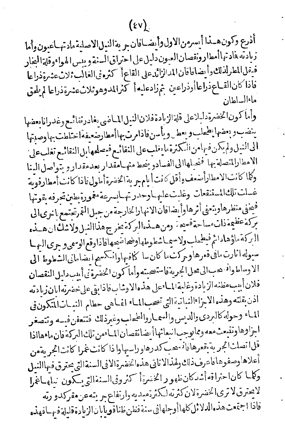 فيصلحها، بل النقائع تغلب على الأمطار المتّصلة بها فتحيلها إلى الفساد وينحط منها مقدار بعد مقدار ويتواصل إلينا، وكلما كانت الأمطار أضعف وأقل، كانت أيام جري الخضرة أطول فإذا كانت أمطار قوية، غسلت تلك المستنقعات وغلبت عليها وحورتها بسرعة، مغمورة بطين تجرفه بقوّتها فيخفي منظرها، ويتعفى أثرها، وأيضا فإن الأنهار الخارجة من جبل القمر تجتمع بأخرى إلى بركة عظيمة ذات مساحة فسيحة ومن هذه البركة يخرج هذا النيل، ولا شك في أن هذه البركة ملؤها دائم فيطحلب ولا سيّما شطوطها وضحاضحها، فإذا وقع الوسمي وجرى إليها سيوله، أثارت ما في قعرها وحركت ما كان ساكنا فيها وانكسح أيضا ما في الشطوط إلى الأوساط وانسحبت إلى حمل الجرية فاستصحبته، وأما كون الخضرة في أبيب دليل النقصان فلأن أبيب مظنة الزيادة وغلبة الماء على هذه الأوشاب، فإذا بقي على خضرته إبّان زيادته أذِن بقلَّته، وهذه الأجزاء النباتية التي تصحب الماء إنما هي حطام النبات المتكوِّن في الماء وحوله كالبردي والديس والسمار المطحلب وغير ذلك، فتعفّن فيه وتصفّر أجزاؤه وتنبعث معه، ومما يوجب انبعاثها أيضا نقصان الماء من تلك البركة فإن ماءها إذا قلّ اتصلت الجرية بقعرها فانسحب كدَرُها وراسِبها، وإذا كانت غمرا كانت الجرية من أعلاها وصفوها فاعرف ذلك، ولهذا لا تأتي هذه الخضرة إلّا في السنة التي يحترق فيها النيل وكلما كان احتراقه أشد، كان ظهور الخضرة أكثر، وفي السنة التي كون نيلها غمرا لا يحترق لا ترى الخضرة، لأن كثرته لكثرة مبدية وارتفاع جريه عن مقر كدورته،