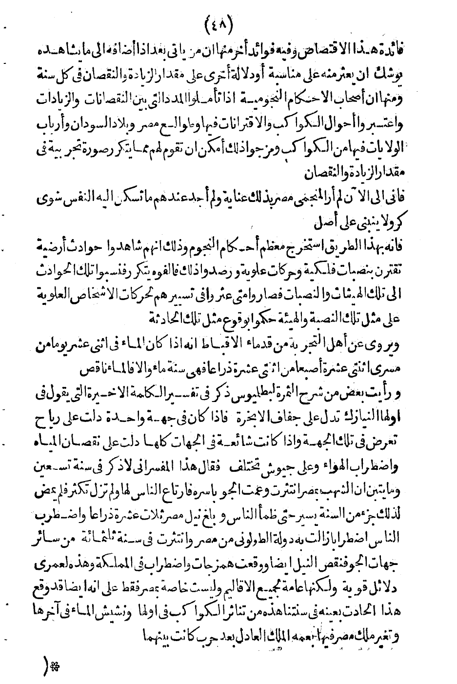 والنقصان في كل سنة، ومنها أن أصحاب الأحكام النجومية إذا تأمّلوا المُدد التي بين النقصانات والزيادات، واعتبروا أحوال الكواكب والاقترانات فيها وطوالع مصر وبلاد السودان وأرباب الولايات فيها من الكواكب ومزجوا ذلك، أمكن أن تقوم لهم مما يتكرر صورة تجريبية في مقدار الزيادة والنقصان، فإني إلى الآن لم أر لمنجِّمي مصر بذلك عناية، ولم أجد عندهم ما تسكن إليه النفس سوى كسر ولا ينبني على أصل.