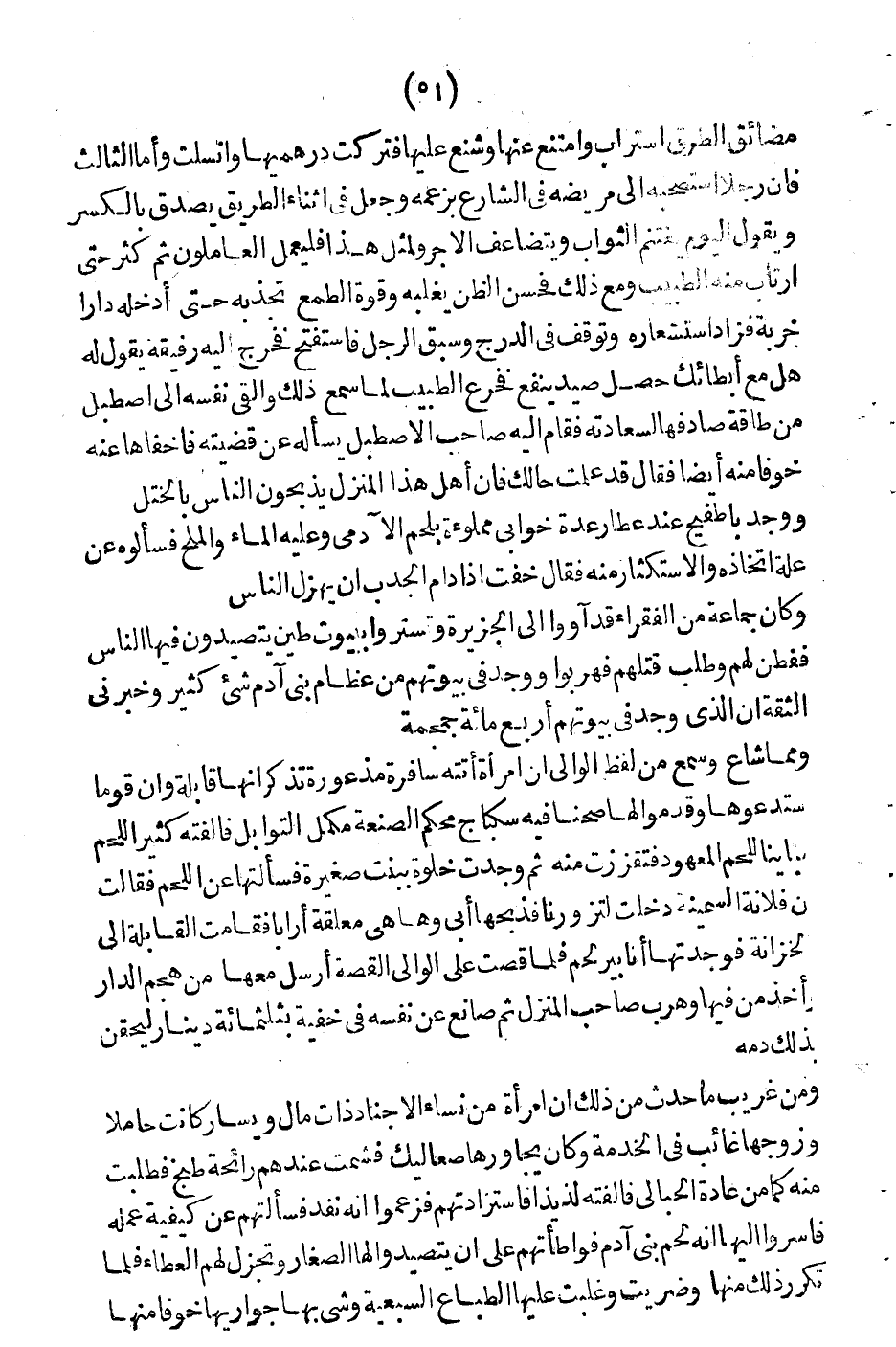 ومن غريب ما حدث من ذلك، أن امرأةً ذات مالٍ ويسار كانت حاملا وزوجها غائب في الخدمة وكان يجاورها صعاليك، فشَّمت عندهم رائحة طبخ فطلبت منه كما هي عادة الحبالى فالفته لذيذا فاستزادتهم، فزعموا أنه نفذ فسألتهم عن كيفية عمله فأسروا إليها أنه لحم بني آدم فواطأتهم على أن يتصيَّدوا لها الصغار وتُجزلُ لهم العطاء فلما تكرَّر ذلك منها فضرِيَت وغلَبت عليها الطِّباع السبعية، وشى بها جواريها خوفاً منها،