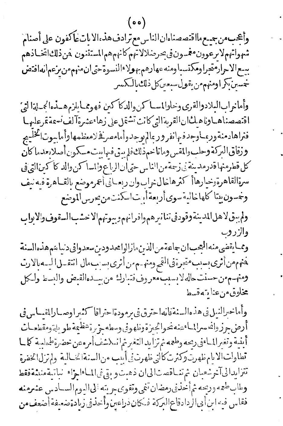 وأما خراب البلاد والقُرى وخلوّ المساكن والدكاكين، فهو مما يلزم هذه الجملة التي اقتصصناها وناهيك أن القرية التي كانت تشتمل على زهاء عشرة آلاف نسمة تمرُّ عليها فتراها دمنة وربما وجد فيها وربما لم يوجد، وأما مصر فخلا معظمها وأما بيوت الخليج وزقاق البركة وحلب والمقس وما تاخم ذلك، فلم يبقَ فيها بيتٌ مسكونٌ أصلا بعد ما كان كلّ قطرٍ منها قدر مدينةٍ زحمةٍ من الناس، حتّى أنّ الرباع والمساكن والدكاكين التي في سرة القاهرة وخيارها أكثرها حال خراب، وإن ربعاً في أعمر موضع بالقاهرة فيه نيِّفٌ وخمسون بيتا كلّها خالية سوى أربعة بيوت أَسكنت من يحرس الموضع.
