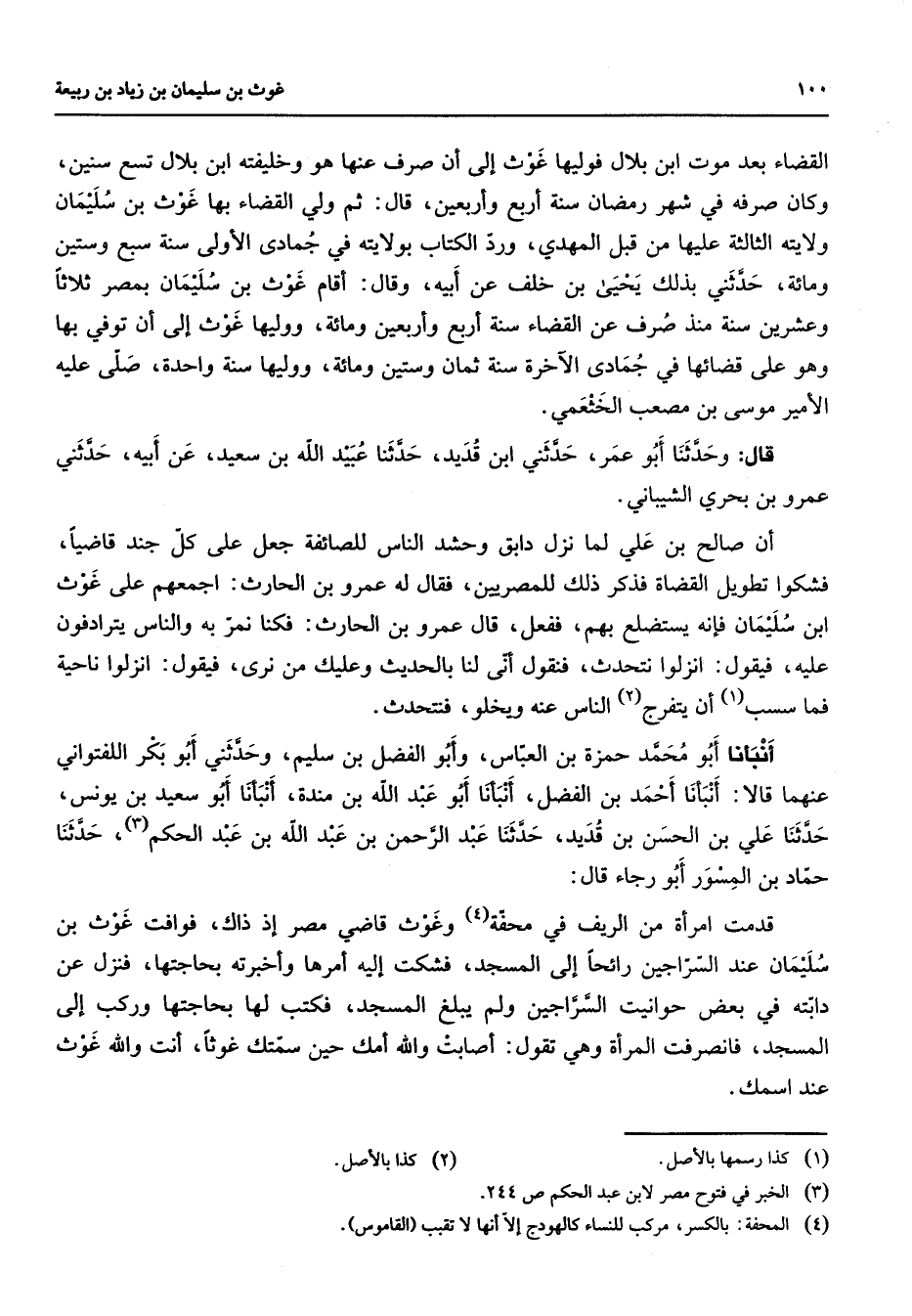 القضاء بعد موت ابن بلال فوليها غوث إلى أن صرف عنها هو وخليفته ابن بلال تسع سنين وكان صرفه في شهر رمضان سنة أربع وأربعين قال ثم ولي القضاء بها غوث بن سليمان ولايته الثالثة عليها من قبل المهدي ورد الكتاب بولايته في جمادى الأولى سنة سبع وستين ومائة حدثني بذلك يحيى بن خلف عن أبيه وقال أقام غوث بن سليمان بمصر ثلاثا وعشرين سنة منذ صرف عن القضاء سنة أربع وأربعين ومائة ووليها غوث إلى أن توفي بها وهو على قضائها في جمادى الآخرة سنة ثمان وستين ومائة ووليها سنة واحدة صلى عليه الأمير موسى بن مصعب الخثعمي قال وحدثنا أبو عمر حدثني ابن قديد حدثنا عبيد الله بن سعيد عن أبيه حدثني عمرو بن بحري الشيباني أن صالح بن علي لما نزل دابق وحشد الناس للصائفة جعل على كل جند قاضيا فشكوا تطويل القضاة فذكر ذلك للمصريين فقال له عمرو بن الحارث اجمعهم على غوث ابن سليمان فإنه يستضلع بهم ففعل قال عمرو بن الحارث فكنا نمر به والناس يترادفون عليه فيقول انزلوا نتحدث فنقول أنى لنا بالحديث وعليك من نرى فيقول انزلوا ناحية فما سسب (1) أن يتفرج (2) الناس عنه ويخلو فنتحدث أنبأنا أبو محمد حمزه بن العباس وأبو الفضل بن سليم وحدثني أبو بكر اللفتواني عنهما قالا أنبأنا أحمد بن الفضل أنبأنا أبو عبد الله بن مندة أنبأنا أبو سعيد بن يونس حدثنا علي بن الحسن بن قديد حدثنا عبد الرحمن بن عبد الله بن عبد الحكم (3) حدثنا حماد بن المسور أبو رجاء قال قدمت امرأة من الريف في محفة (4) وغوث قاضي مصر إذ ذاك فوافت غوث بن سليمان عند السراجين رائحا إلى المسجد فشكت إليه أمرها وأخبرته بحاجتها فنزل عن دابته في بعض حوانيت السراجين ولم يبلغ المسجد فكتب لها بحاجتها وركب إلى المسجد فانصرفت المرأة وهي تقول أصابت والله أمك حين سمتك غوثا أنت والله غوث عند اسمك