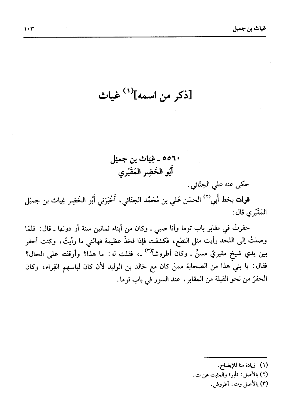 5560 - غياث بن جميل أبو الخضر المقبري حكى عنه علي الحنائي قرأت بخط أبي (2) الحسن علي بن محمد الحنائي أخبرني أبو الخضر غياث بن جميل المقبري قال حفرت في مقابر باب توما وأنا صبي وكان من أبناء ثمانين سنة أو دونها قال فلما وصلت إلى اللحد رأيت مثل النطع فكشفت فإذا فخد عظيمة فهالني ما رأيت وكنت أحفر بين يدي شيخ مقبري مسن وكان أطروشا (3) فقلت له ما هذا وأوقفته على الحال فقال يا بني هذا من الصحابة ممن كان مع خالد بن الوليد لأن كان لباسهم الفراء وكان الحفر من نحو القبلة من المقابر عند السور في باب توما