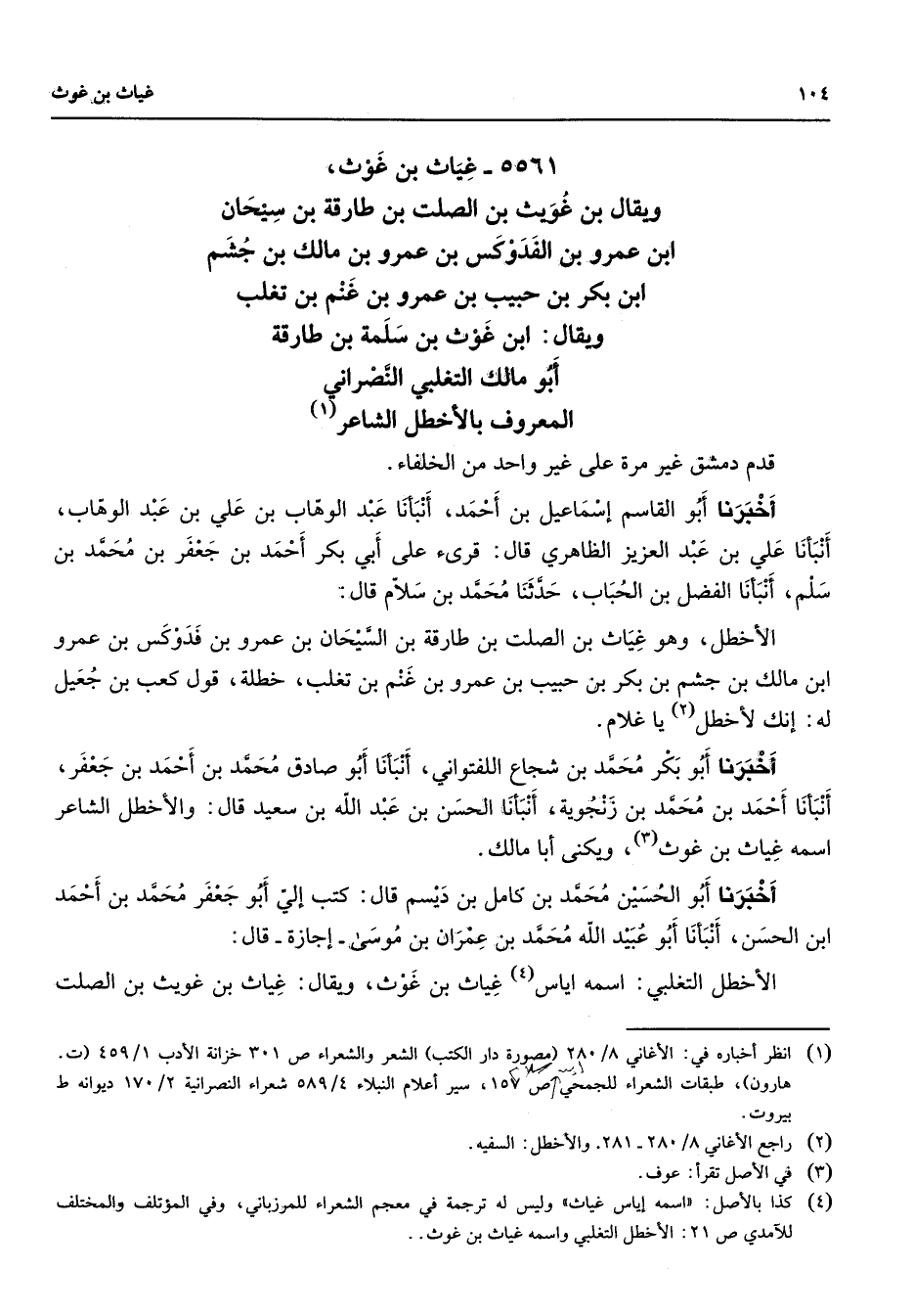 5561 - غياث بن غوث ويقال بن غويث بن الصلت بن طارقه بن سيحان ابن عمرو بن الفدوكس بن عمرو بن مالك بن جشم ابن بكر بن حبيب بن عمرو بن غنم بن تغلب ويقال ابن غوث بن سلمة بن طارقة أبو مالك التغلبي النصراني المعروف بالأخطل الشاعر (1) قدم دمشق غير مرة على غير واحد من الخلفاء أخبرنا أبو القاسم إسماعيل بن أحمد أنبأنا عبد الوهاب بن علي بن عبد الوهاب أنبأنا علي بن عبد العزيز الظاهري قال قرئ على أبي بكر أحمد بن جعفر بن محمد بن سلم أنبأنا الفضل بن الحباب حدثنا محمد بن سلام قال الأخطل وهو غياث بن الصلت بن طارقة بن السيحان بن عمرو بن فدوكس بن عمرو ابن مالك بن جشم بن بكر بن حبيب بن عمرو بن غنم بن تغلب خطلة قول كعب بن جعيل له إنك لأخطل (2) يا غلام أخبرنا أبو بكر محمد بن شجاع اللفتواني أنبأنا أبو صادق محمد بن أحمد بن جعفر أنبأنا أحمد بن محمد بن زنجوية أنبأنا الحسن بن عبد الله بن سعيد قال والأخطل الشاعر اسمه غياث بن غوث (3) ويكنى أبا مالك أخبرنا أبو الحسين محمد بن كامل بن ديسم قال كتب إلي أبو جعفر محمد بن أحمد ابن الحسن أنبأنا أبو عبيد الله محمد بن عمران بن موسى إجازة قال الأخطل التغلبي اسمه اياس (4) غياث بن غوث ويقال غياث بن غويث بن الصلت