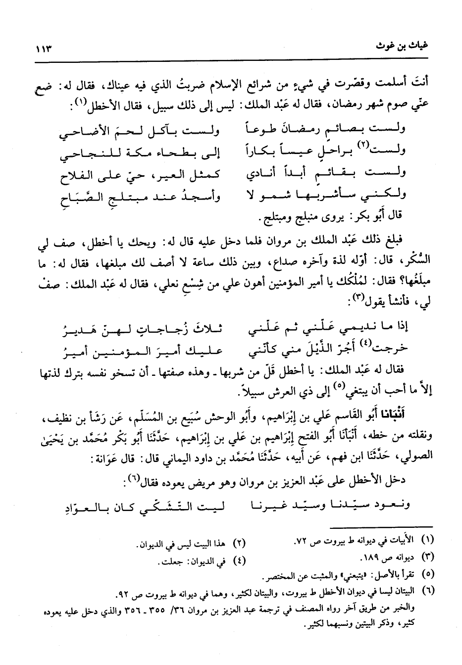 أنت أسلمت وقصرت في شئ من شرائع الإسلام ضربت الذي فيه عيناك فقال له ضع عني صوم شهر رمضان فقال له عبد الملك ليس ألى ذلك سبيل فقال الأخطل (1) ولست بصائم رمضان طوعا * ولست بآكل لحم الأضاحي ولست براحل عيسا بكارا * إلى بطحاء مكة للنجاحي ولست (2) بقائم أبدا أنادي * كمثل العير حي على الفلاح ولكني سأشربها شمو لا * وأسجد عند مبتلج الصباح * قال أبو بكر يروي منبلج ومبتلج فبلغ ذلك عبد الملك بن مروان فلما دخل عليه قال له ويحك يا أخطل صف لي السكر قال أوله لذة وآخره صداع وبين ذلك ساعة لا أصف لك مبلغها فقال له ما مبلغها فقال لملكك يا أمير المؤمنين أهون علي من شسع نعلي فقال له عبد الملك صف لي فأنشأ يقول (3) * إذا ما نديمي علني ثم علني * ثلاث زجاجات لهن هدير خرجت (4) أجر الذيل مني كأنني * عليك أمير المؤمنين أمير * فقال له عبد الملك يا أخطل قل من شربها وهذه صفتها أن تسخو نفسه بترك لذتها إلا ما أحب أن يبتغي (5) إلى ذي العرش سبيلا أنبأنا أبو القاسم علي بن إبراهيم وأبو الوحش سبيع بن المسلم عن رشأ بن نظيف ونقلته من خطه أنبأنا أبو الفتح إبراهيم بن علي بن إبراهيم حدثنا أبو بكر محمد بن يحيى الصولي حدثنا ابن فهم عن أبيه حدثنا محمد بن داود اليماني قال قال عوانة دخل الأخطل على عبد العزيز بن مروان وهو مريض يعوده فقال (6) * ونعود سيدنا وسيد غيرنا * ليت التشكي كان بالعواد