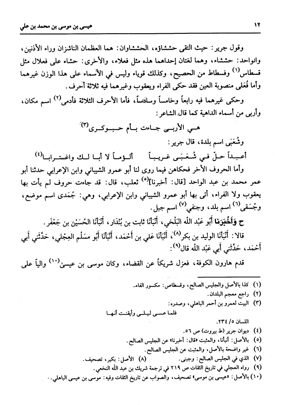وقول جرير حيث التقى حششاؤه الحششاوان هما العظمان الناشزان وراء الأذنين والواحد حششاء وهما لغتان إحداهما هذه مثل فعلاء والأخرى حشاء على فعلال مثل قسطاس (1) وفسطاط من الحصيح وكذلك قوياء وليس في الأسماء على هذا الوزن غيرهما وأما فعلى منصوبة العين فقد حكى الفراء ويعقوب وغيرهما فيه ثلاثة أحرف وحكى غيرهما فيه رابعا وخامسا وسادسا فأما الأحرف الثلاثة فأدمى (2) اسم مكان وأربى من أسماء الداهية كما قال الشاعر * هي الأربى جاءت بأم حبوكرى (3) وشعبي اسم بلدة قال جرير أعبدا حل في شعبى غريبا * ألؤما لا أبا لك واغترابا (4) وأما الحروف الأخر فحكاهن فيما روى لنا أبو عمرو الشيباني وابن الإعرابي حدثنا أبو عمر محمد بن عبد الواحد قال أخبرنا (5) ثعلب قال قد جاءت حروف لم يأت بها يعقوب ولا الفراء أتى بها أبو عمرو الشيباني وابن الأعرابي وهي جمدى اسم موضع وجسقى (6) اسم بلد وجنفى (7) اسم جبل ح وأخبرنا أبو عبد الله البلخي أنبأنا ثابت بن بندار أنبأنا الحسين بن جعفر قالا أنبأنا الوليد بن بكر (8) أنبأنا علي بن أحمد أنبأنا أبو مسلم العجلي حدثني أبي أحمد حدثني أبي عبد الله قال (9) قدم هارون الكوفة فعزل شريكا عن القضاء وكان موسى بن عيسى (10) واليا على