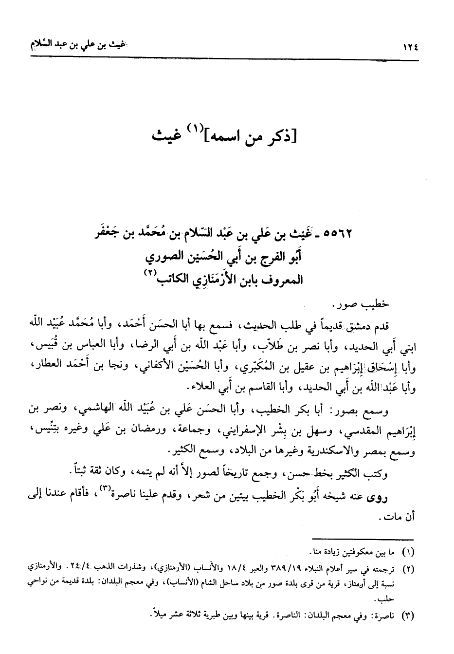 5562 - غيث بن علي بن عبد السلام بن محمد بن جعفر أبو الفرج بن أبي الحسين الصوري المعروف بابن الأرمنازي الكاتب (2) خطيب صور قدم دمشق قديما في طلب الحديث فسمع بها أبا الحسن أحمد وأبا محمد عبيد الله ابني أبي الحديد وأبا نصر بن طلاب وأبا عبد الله بن أبي الرضا وأبا العباس بن قبيس وأبا إسحاق إبراهيم بن عقيل بن المكبري وأبا الحسين الأكفاني ونجا بن أحمد العطار وأبا عبد الله بن أبي الحديد وأبا القاسم بن أبي العلاء وسمع بصور أبا بكر الخطيب وأبا الحسن علي بن عبيد الله الهاشمي ونصر بن إبراهيم المقدسي وسهل بن بشر الإسفرايني وجماعة ورمضان بن علي وغيره بتنيس وسمع بمصر والاسكندرية وغيرها من البلاد وسمع الكثير وكتب الكثير بخط حسن وجمع تاريخا لصور إلا أنه لم يتمه وكان ثقة ثبتا روى عنه شيخه أبو بكر الخطيب بيتين من شعر وقدم علينا ناصرة (3) فأقام عندنا إلى أن مات