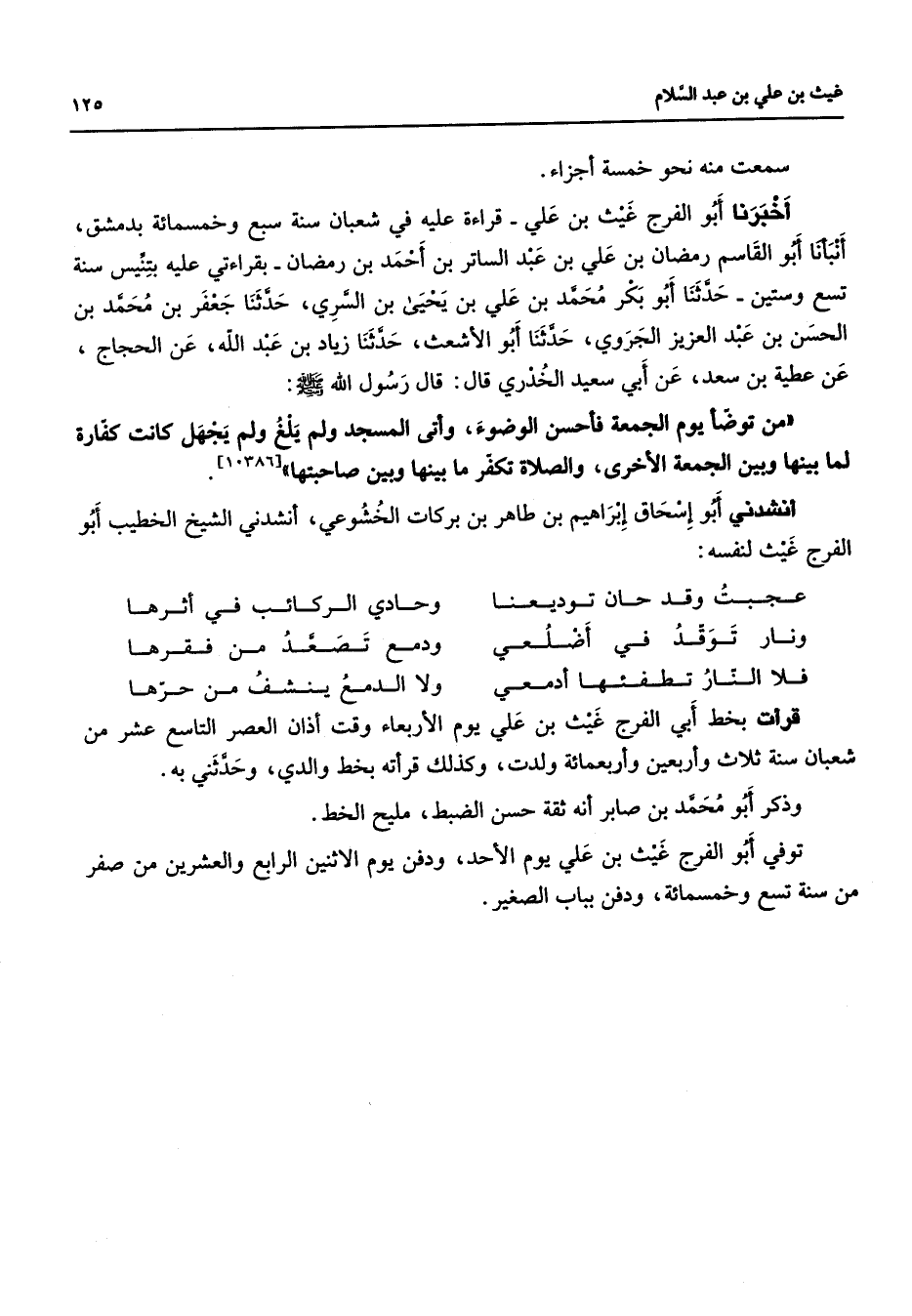 سمعت منه نحو خمسة أجزاء أخبرنا أبو الفرج غيث بن علي قراءة عليه في شعبان سنة سبع وخمسمائة بدمشق أنبأنا أبو القاسم رمضان بن علي بن عبد الساتر بن أحمد بن رمضان بقراءتي عليه بتنيس سنة تسع وستين حدثنا أبو بكر محمد بن علي بن يحيى بن السري حدثنا جعفر بن محمد بن الحسن بن عبد العزيز الجروي حدثنا أبو الأشعث حدثنا زياد بن عبد الله عن الحجاج عن عطية بن سعد عن أبي سعيد الخدري قال قال رسول الله (صلى الله عليه وسلم) (من توضأ يوم الجمعة فأحسن الوضوء وأتى المسجد ولم يلغ ولم يجهل كانت كفارة لما بينها وبين الجمعة الأخرى والصلاة تكفر ما بينها وبين صاحبتها) أنشدني أبو إسحاق إبراهيم بن طاهر بن بركات الخشوعي أنشدني الشيخ الخطيب أبو الفرج غيث لنفسه عجبت وقد حان توديعنا * وحادي الركائب في أثرها ونار توقد في أضلعي * ودمع تصعد من فقرها فلا النار تطفئها أدمعي * ولا الدمع ينشف من حرها * قرأت بخط أبي الفرج غيث بن علي يوم الأربعاء وقت أذان العصر التاسع عشر من شعبان سنة ثلاث وأربعين وأربعمائة ولدت وكذلك قرأته بخط والدي وحدثني به وذكر أبو محمد بن صابر أنه ثقة حسن الضبط مليح الخط توفي أبو الفرج غيث بن علي يوم الأحد ودفن يوم الاثنين الرابع والعشرين من صفر من سنة تسع وخمسمائة ودفن بباب الصغير "