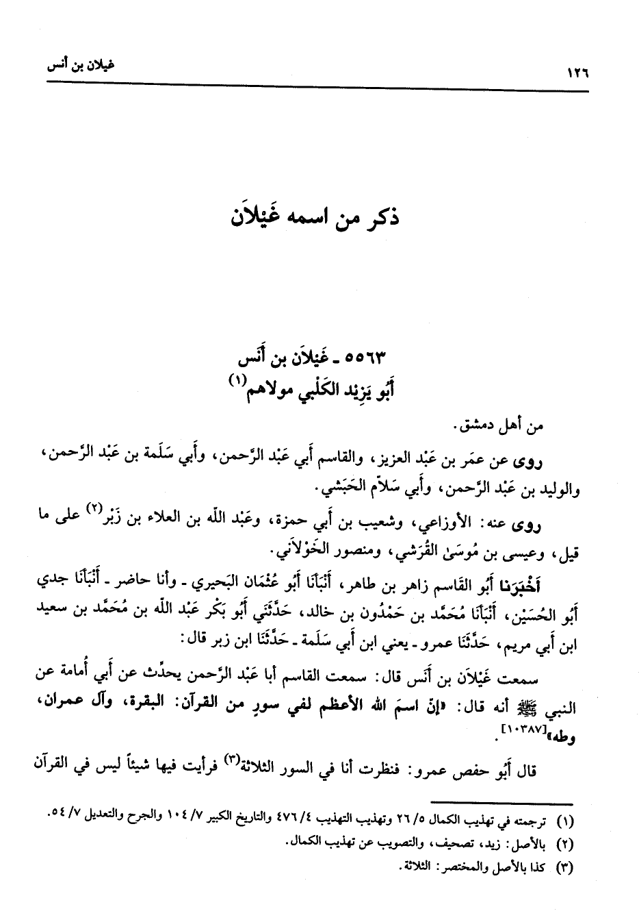 5563 - غيلان بن أنس أبو يزيد الكلبي مولاهم (1) من أهل دمشق روى عن عمر بن عبد العزيز والقاسم أبي عبد الرحمن وأبي سلمة بن عبد الرحمن والوليد بن عبد الرحمن وأبي سلام الحبشي روى عنه الأوزاعي وشعيب بن أبي حمزة وعبد الله بن العلاء بن زبر (2) على ما قيل وعيسى بن موسى القرشي ومنصور الخولاني أخبرنا أبو القاسم زاهر بن طاهر أنبأنا أبو عثمان البحيري وأنا حاضر أنبأنا جدي أبو الحسين أنبأنا محمد بن حمدون بن خالد حدثني أبو بكر عبد الله بن محمد بن سعيد ابن أبي مريم حدثنا عمرو يعني ابن أبي سلمة حدثنا ابن زبر قال سمعت غيلان بن أنس قال سمعت القاسم أبا عبد الرحمن يحدث عن أبي أمامة عن النبي (صلى الله عليه وسلم) أنه قال (إن اسم الله الأعظم لفي سور من القرآن البقرة وآل عمران وطه) قال أبو حفص عمرو فنظرت أنا في السور الثلاثة (3) فرأيت فيها شيئا ليس في القرآن