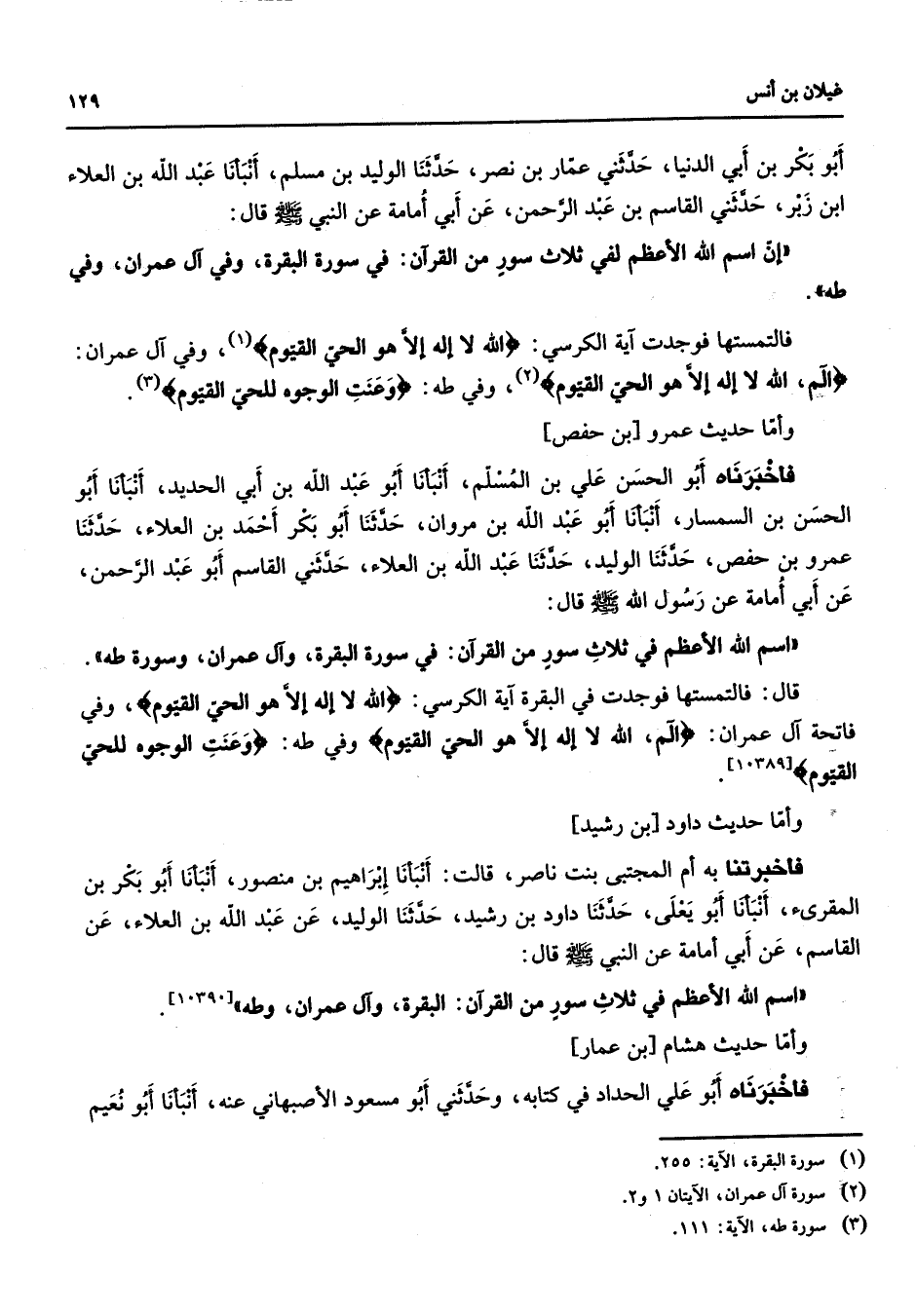 أبو بكر بن أبي الدنيا حدثني عمار بن نصر حدثنا الوليد بن مسلم أنبأنا عبد الله بن العلاء ابن زبر حدثني القاسم بن عبد الرحمن عن أبي أمامة عن النبي (صلى الله عليه وسلم) قال (إن اسم الله الأعظم لفي ثلاث سور من القرآن في سورة البقرة وفي آل عمران وفي طه) فالتمستها فوجدت آية الكرسي " الله لا إله إلا هو الحي القيوم (1) " وفي آل عمران " آلم الله لا إله إلا هو الحي القيوم " (2) وفي طه " وعنت الوجوه للحي القيوم " (3) وأما حديث عمرو بن حفص فأخبرناه أبو الحسن علي بن المسلم أنبأنا أبو عبد الله بن أبي الحديد أنبأنا أبو الحسن بن السمسار أنبأنا أبو عبد الله بن مروان حدثنا أبو بكر أحمد بن العلاء حدثنا عمرو بن حفص حدثنا الوليد حدثنا عبد الله بن العلاء حدثني القاسم أبو عبد الرحمن عن أبي أمامة عن رسول الله (صلى الله عليه وسلم) قال (اسم الله الأعظم في ثلاث سور من القرآن في سورة البقرة وآل عمران وسورة طه قال فالتمستها فوجدت في البقرة آية الكرسي " الله لا إله إلا هو الحي القيوم " وفي فاتحة آل عمران " الم الله لا إله إلا هو الحي القيوم " وفي طه " وعنت الوجوه للحي القيوم " وأما حديث داود بن رشيد فأخبرتنا به أم المجتبى بنت ناصر قالت أنبأنا إبراهيم بن منصور أنبأنا أبو بكر بن المقرئ أنبأنا أبو يعلى حدثنا داود بن رشيد حدثنا الوليد عن عبد الله بن العلاء عن القاسم عن أبي أمامة عن النبي (صلى الله عليه وسلم) قال اسم الله الأعظم في ثلاث سور من القرآن البقرة وآل عمران وطه وأما حديث هشام بن عمار فأخبرناه أبو علي الحداد في كتابه وحدثني أبو مسعود الأصبهاني عنه أنبأنا أبو نعيم